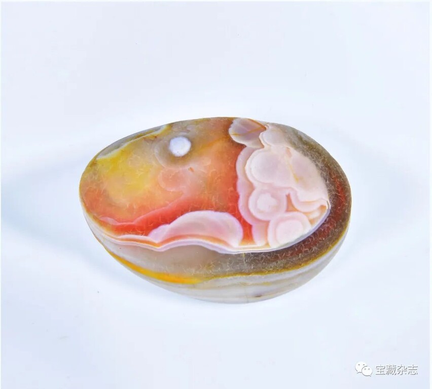 此石畫面明月高掛,彩雲圍繞,紅、黃、白等多色絲紋形成一幅彩雲追月的圖案