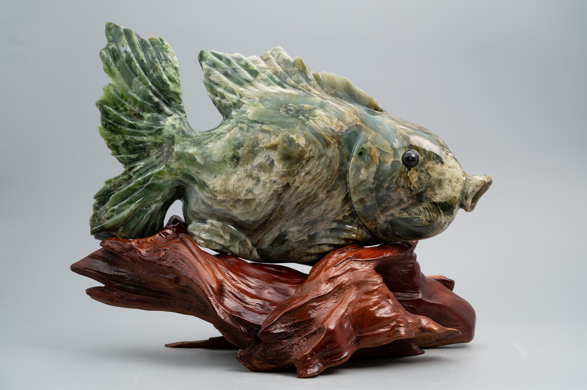 此作品料為早起保留上等之玉料,中大品適當之魚創作雕法“年年有餘”深海魚活躍表現,仍取玉礦中交綴變化之料來呈現,頭部、眼神亦有精神存在、魚尾之翠綠礦料,特色展現出前進游水的力道。整件作品栩栩如生,收藏之“年年有餘”。