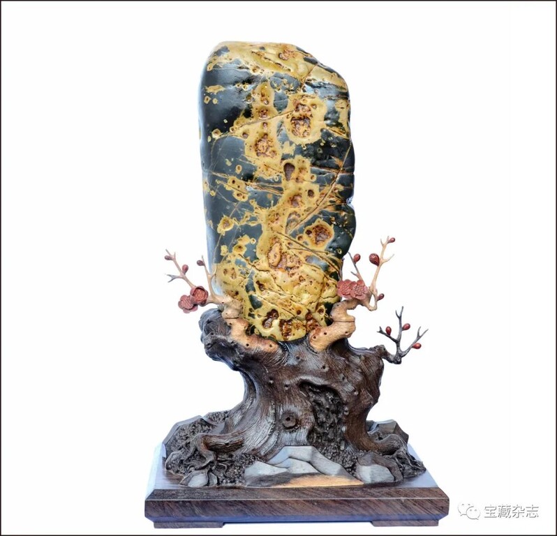 “無意苦爭春,一任群芳妒“,梅花常被民間視作傳春報喜的吉祥象徵。此方九龍璧畫面清晰明快、古樸典雅,樹皮皴裂的粗幹虯枝、纖細平滑的嫩枝、嬌柔鮮豔的花朵與含苞欲放的花蕾,生動地展現出了蒼勁雄健的古梅淩霜傲雪、迎春怒放的畫面,給人以蓬勃向上、生機盎然之感,真可謂天工妙筆,石上生花!