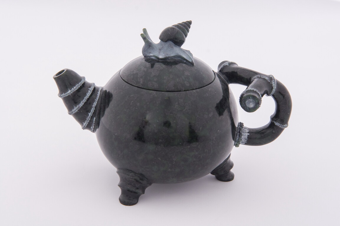 此壺之壺柄與壺嘴為竹節雕刻,壺鈕為代表「安身立命」的蝸牛,竹節則寓意「步步高升」。因應原料特性,保留部分原料巧雕為三足,展現創作者雕刻功力。