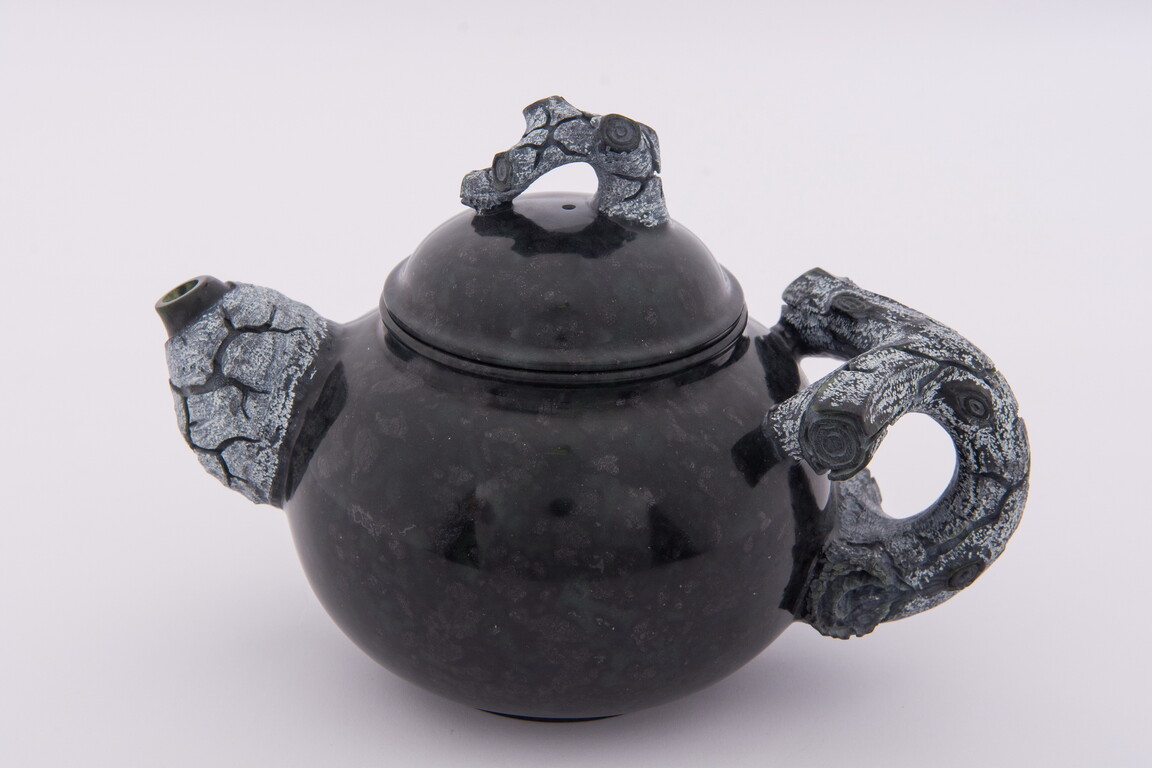 此壺為台灣墨玉原石一體成形,壺柄、壺蓋與壺嘴為木形雕刻,刻意營造粗獷的樹木表皮紋路,此為創作者巧思,當茶湯浸潤,木形將更活靈活現。