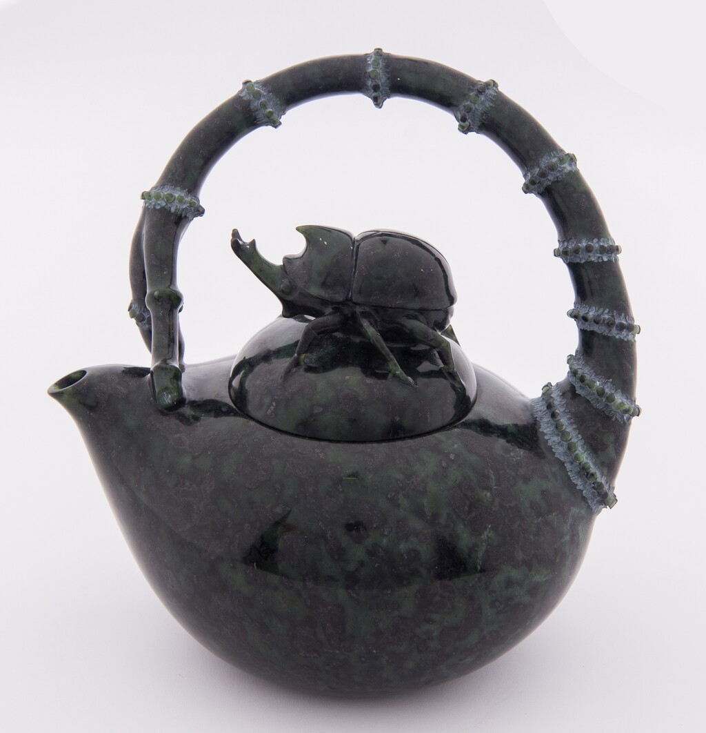 此壺之提把為竹節雕刻,壺鈕為獨角仙,為整塊台灣墨玉一體成形巧雕,展現創作者過人的雕刻功力。