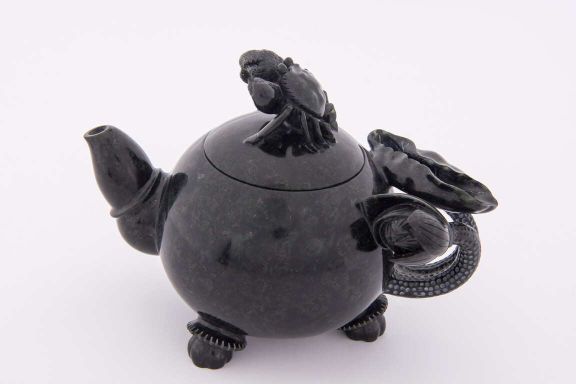 此壺之壺柄為荷葉及含苞待放的荷花,壺鈕為螃蟹,寓意「和諧」。因應原料特性,保留部分原料巧雕為三足,展現創作者雕刻功力。