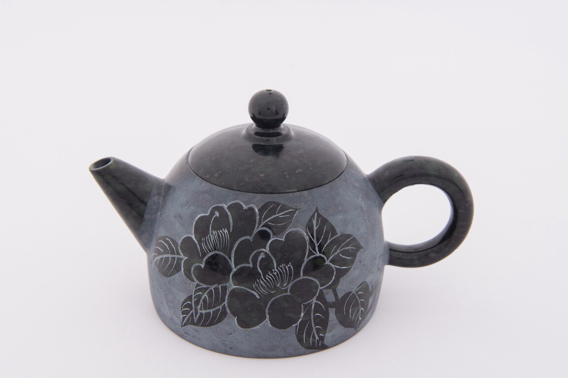 此壺造型簡約,壺身刻有茶花,突顯樸拙的趣味。