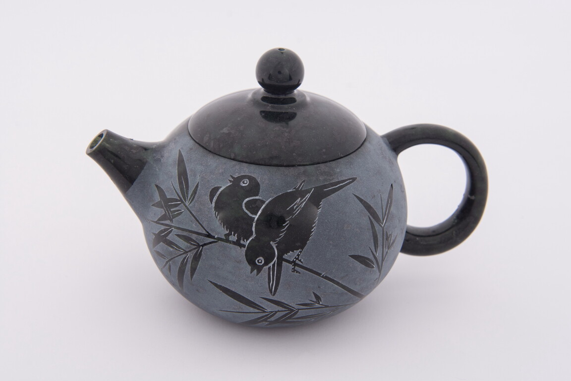 此壺之壺身圓潤,刻有喜鵲在高枝上歡欣鳴叫,因喜鵲的叫聲為「喳喳喳喳,喳喳喳喳」,寓意「喜事到家,喜事到家」,作品滿懷創作者深刻的祝福。此壺身工法為薄雕,比淺浮雕更淺,雕線更薄,也更重意境,即「層薄而富有畫意」,展現創作者過人的雕刻功力。
