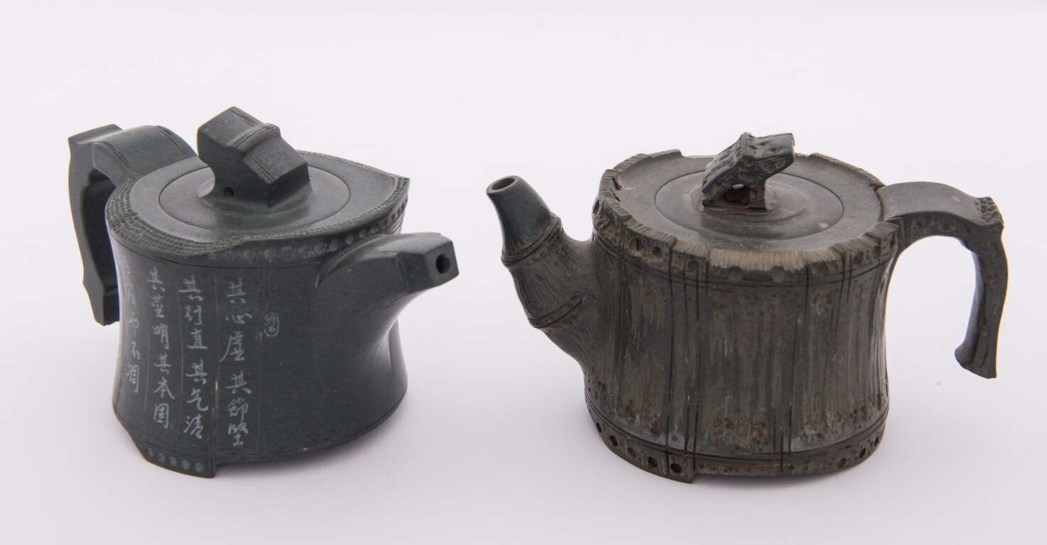 此對壺為竹節造型,壺身薄雕文字述說竹之特性,亦是高潔人品之註解。