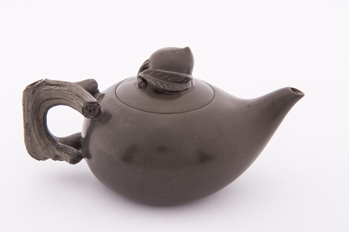 此壺之壺紐為一顆壽桃,壺把為木頭造型,壺身則像神燈,極具巧思。