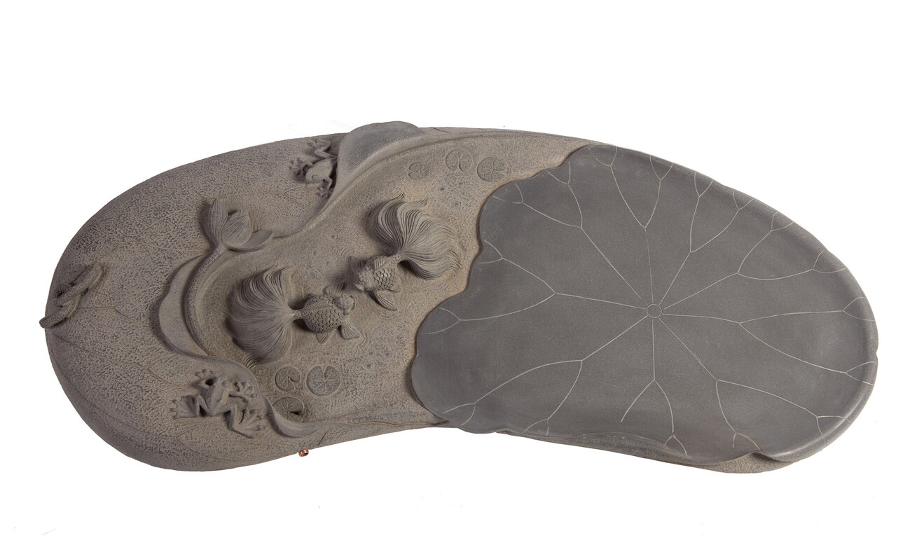 黃櫳賢大師創作的石雕茶盤,利用石頭本身的特色創作,主題包含本土的牧童放牛、蘭花枯木、荷葉金魚、絲瓜藤蔓、螃蟹泥沼、木紋昆蟲等系列,愈發展現過人的雕琢功力。