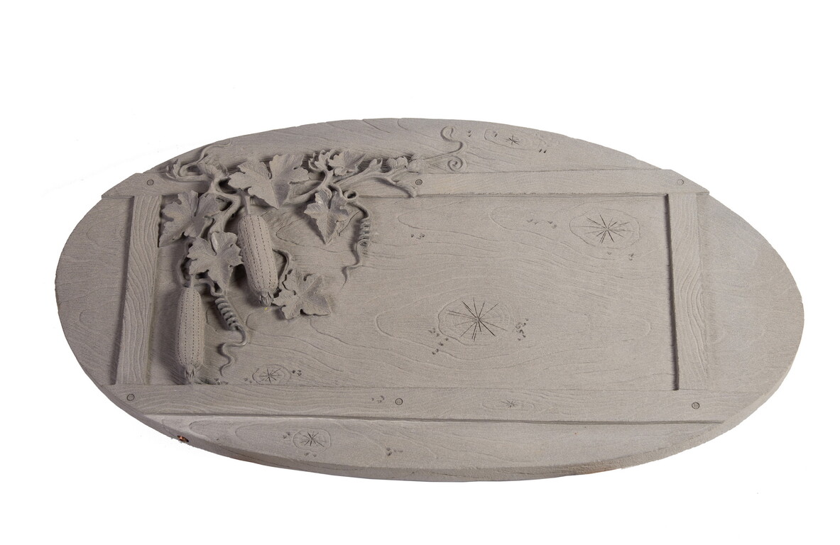 黃櫳賢大師創作的石雕茶盤,利用石頭本身的特色創作,主題包含本土的牧童放牛、蘭花枯木、荷葉金魚、絲瓜藤蔓、螃蟹泥沼、木紋昆蟲等系列,愈發展現過人的雕琢功力。