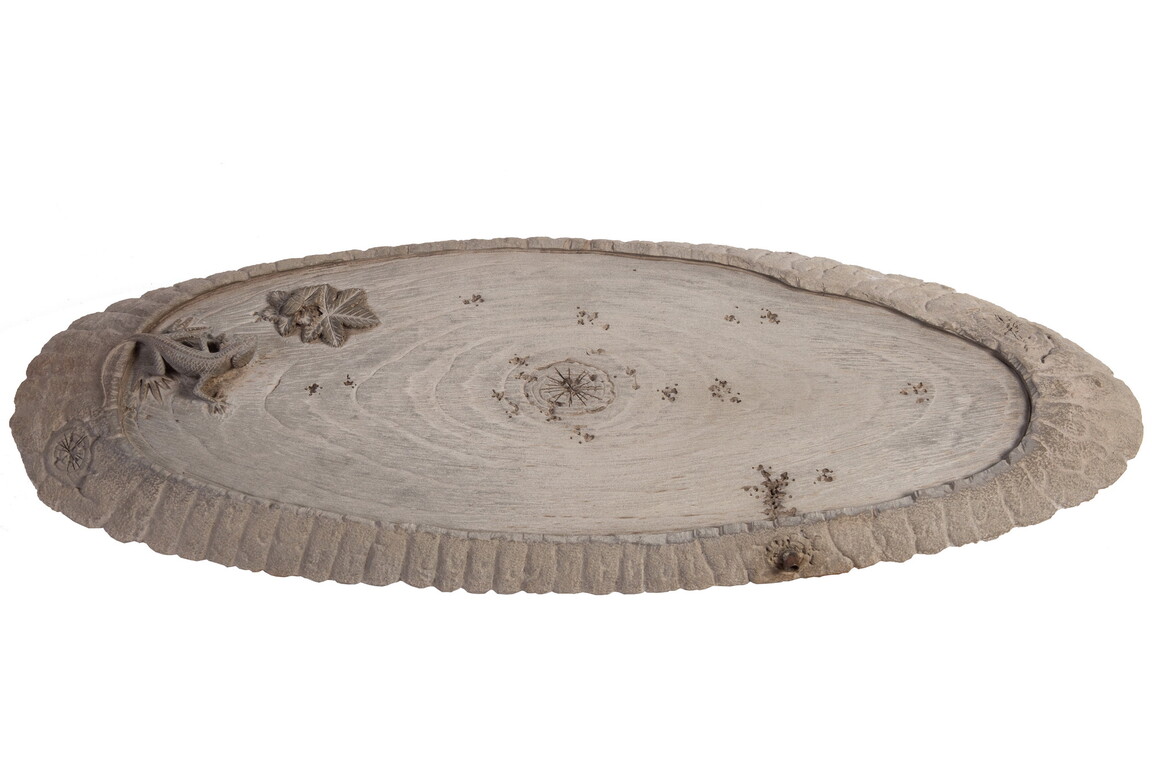 黃櫳賢大師創作的石雕茶盤,利用石頭本身的特色創作,主題包含本土的牧童放牛、蘭花枯木、荷葉金魚、絲瓜藤蔓、螃蟹泥沼、木紋昆蟲等系列,愈發展現過人的雕琢功力。