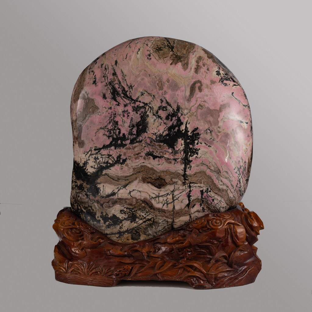 玫瑰石,學名薔薇輝石岩(Rhodonite),摩氏硬度5.5-6.5,三斜晶系。
