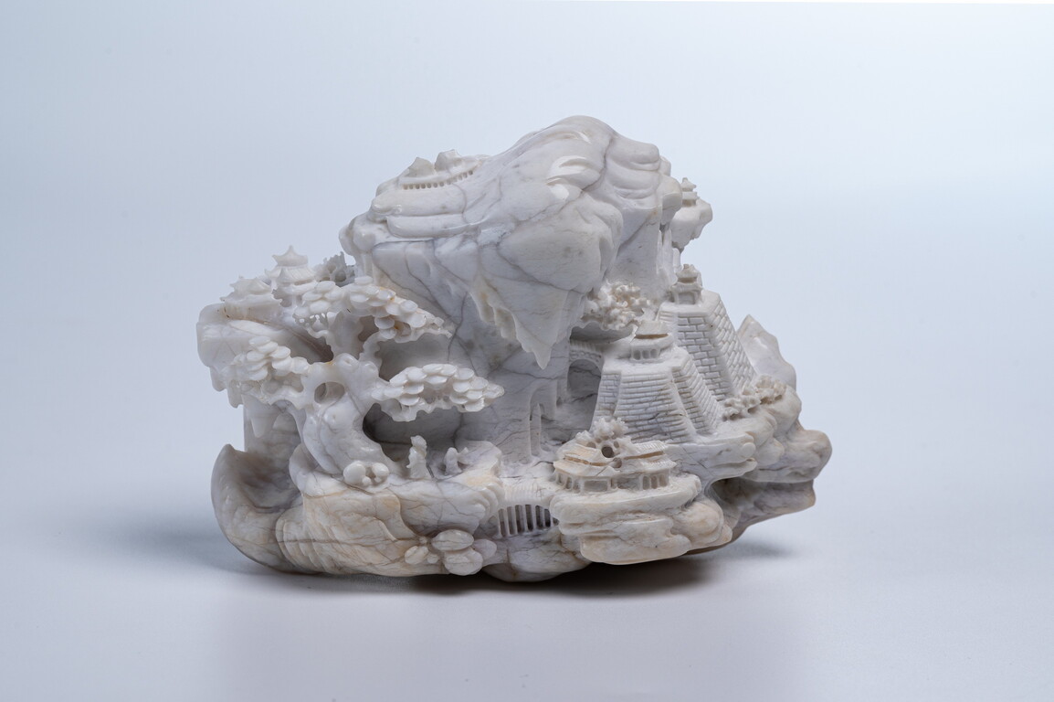 雪花玉的白一般不是十分均勻的白,而有各種不同花紋的變化,並呈漸層式的擴散,如雲、如霧,又如雪花紛飛。透明度高,十分亮潔雅緻。其外層色澤深暗與內層的雪白,呈強烈對比,很適合作為巧雕的素材。