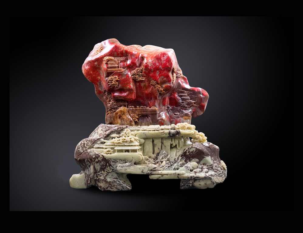 雞血石多出於浙江省昌化縣深山的石隙中,極不易得。當地地層中的金屬礦物經地質變化、高熱氧化融入石中,淡色石質中摻入殷紅色,色澤悅目、鮮紅如血。又因「雞」與「吉」諧音,故名「雞血石」,寓意吉祥。色澤鮮麗豔紅者稱作活血,為上品;呈褐色或暗紅者,則謂死血,質較劣。