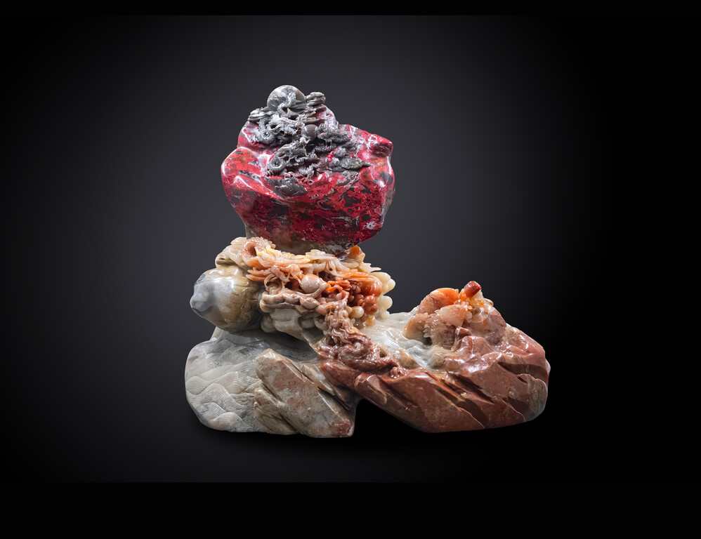 雞血石多出於浙江省昌化縣深山的石隙中,極不易得。當地地層中的金屬礦物經地質變化、高熱氧化融入石中,淡色石質中摻入殷紅色,色澤悅目、鮮紅如血。又因「雞」與「吉」諧音,故名「雞血石」,寓意吉祥。色澤鮮麗豔紅者稱作活血,為上品;呈褐色或暗紅者,則謂死血,質較劣。