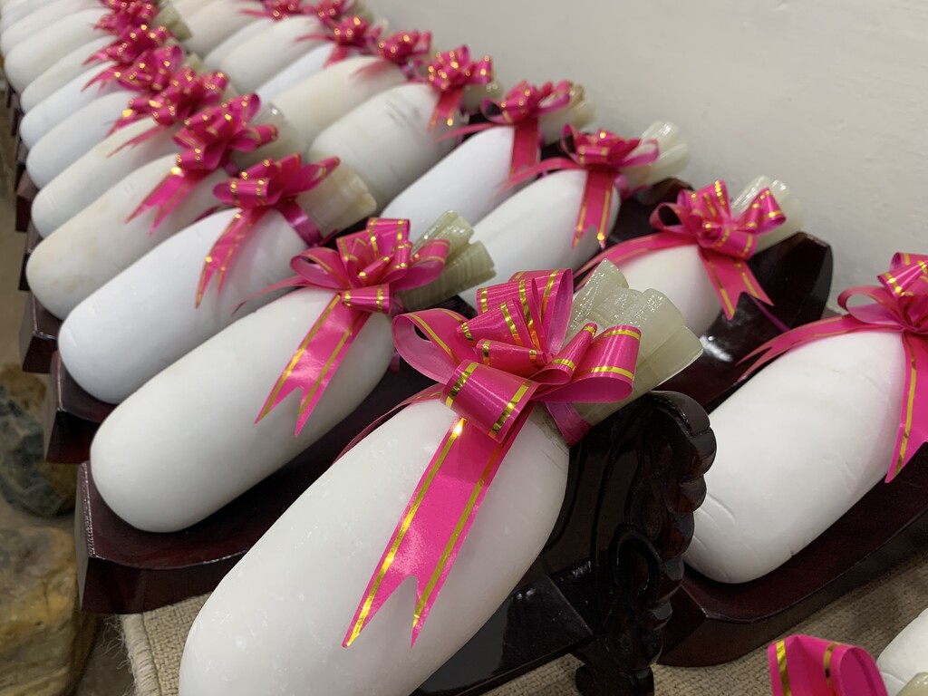 蘿蔔,閩南語發音為「菜頭」,此作品以白大理石雕刻而成,栩栩如生,祈願帶來好運、好兆頭,故名之「好彩頭」。