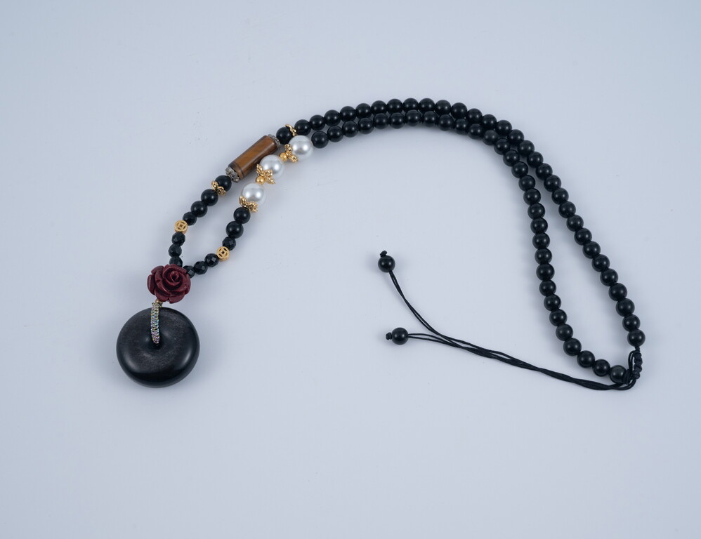 此款設計由黑曜石平安釦為主石,搭配硃砂、虎眼石,有強大阻擋負能量的功效。