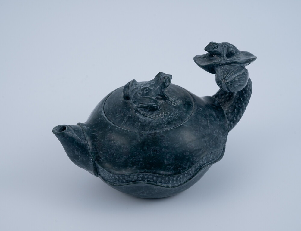頂極整體透光墨玉,雕刻石壺,壺上青蛙、荷葉,寓意和氣生財。