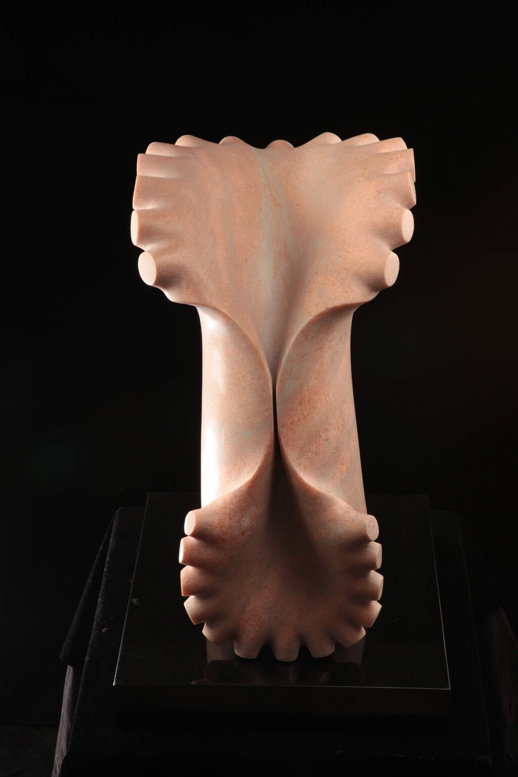 整齊律動的圓柱排列,形塑花朵並蒂雙開的樣貌,粉紅石材應用,以利作品表達富貴好事成雙的喜悅。