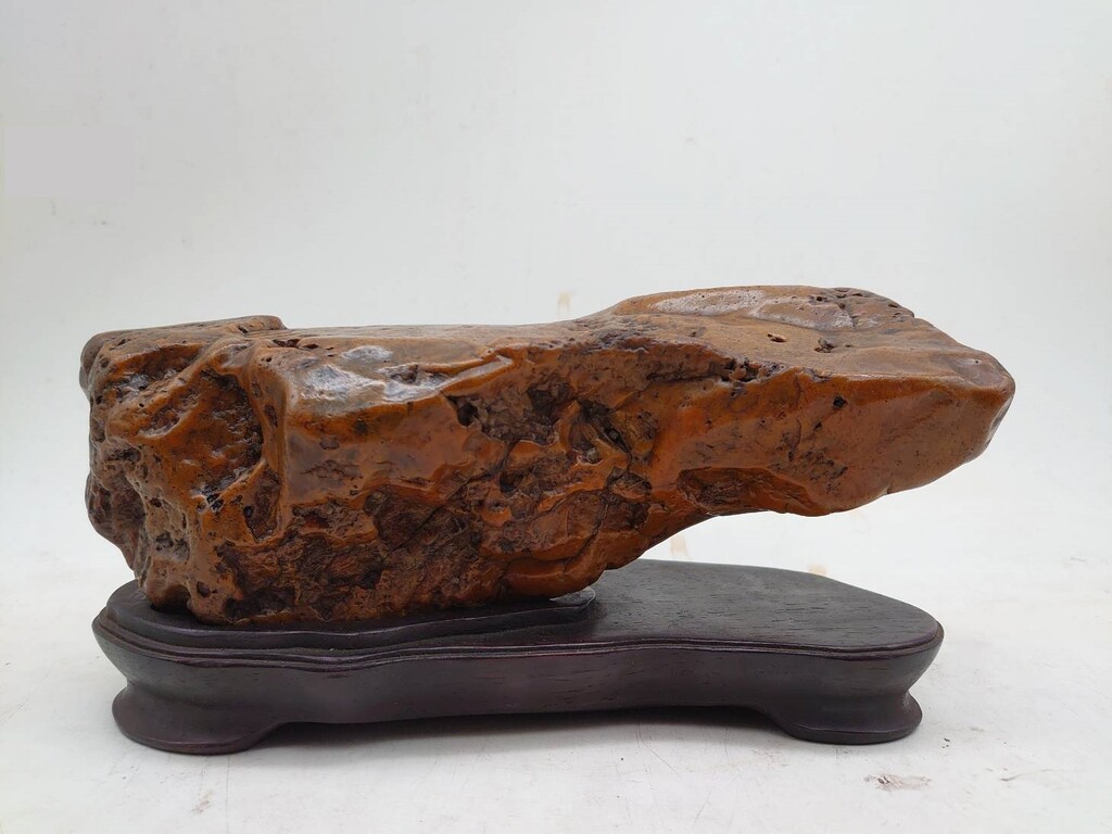 93年自採黄臘石,疼愛已久,上材台座,獨立海崖之景,上方平坦中有小山丘變化,山腰老皺穩健,是-好石