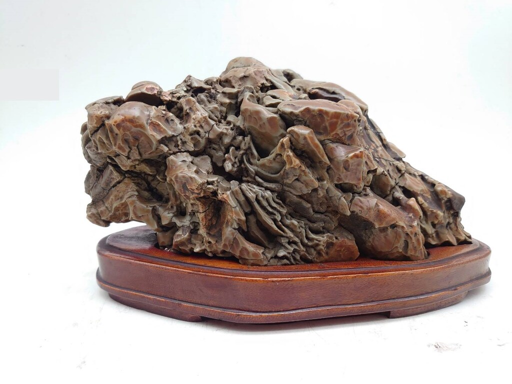 戈壁石中微中大品,其肌理變化皺褶,型態似獨立島嶼,有小浪崖,後腹地斜坡而收尾,整體架構完美。