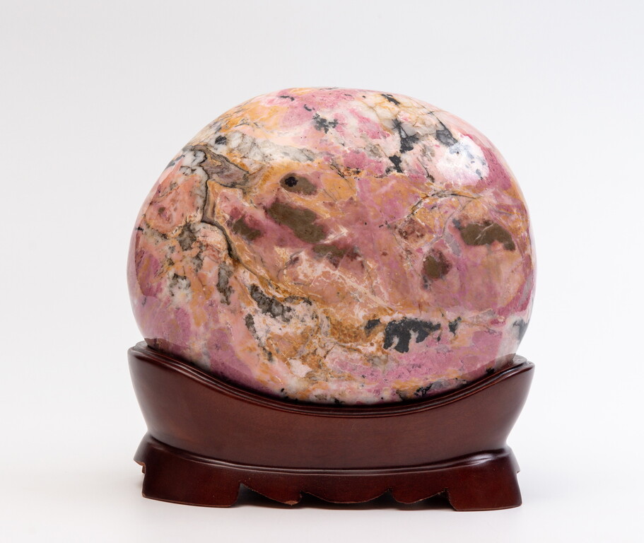 玫瑰石學名薔薇輝石,硬度約6度。主要產在花蓮的木瓜溪、三棧溪及立霧溪等地。其色彩豐富,意境饒趣。