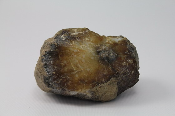 棕色礦皮內,極淡紫玉髓體裡,呈現浪花或雪花狀白色半明紋樣;