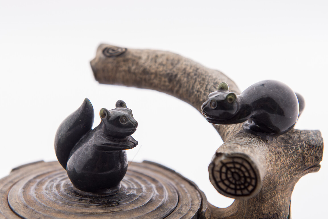 此壺特殊之處在於壺身與壺把刻以木形,顯現樹木表皮粗糙感,壺鈕與壺把上各有一隻可愛的松鼠,相看兩不厭。
