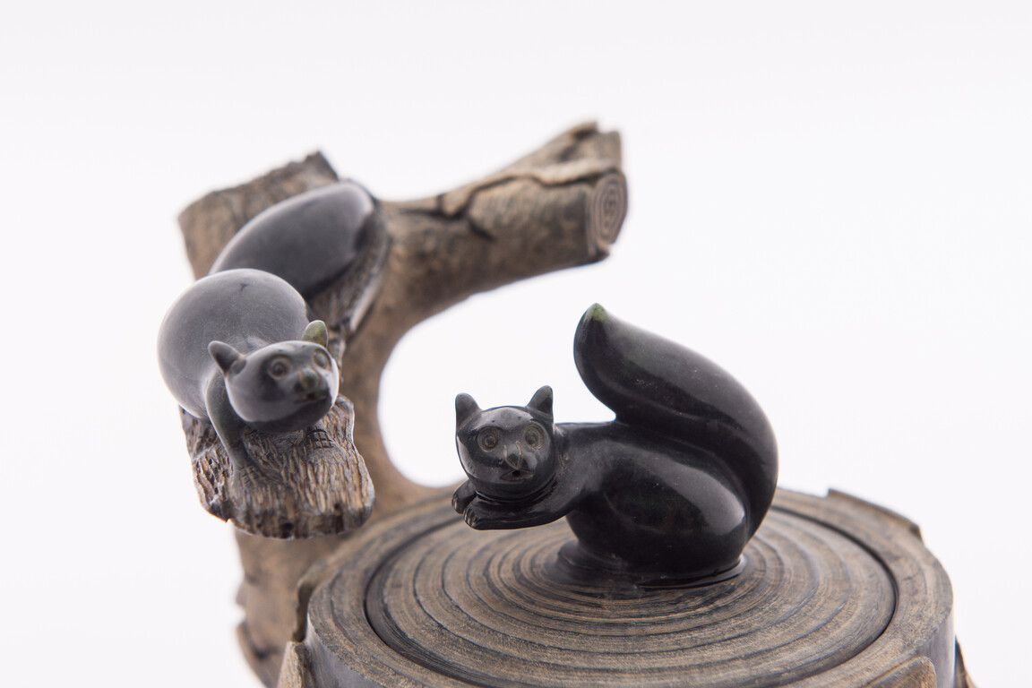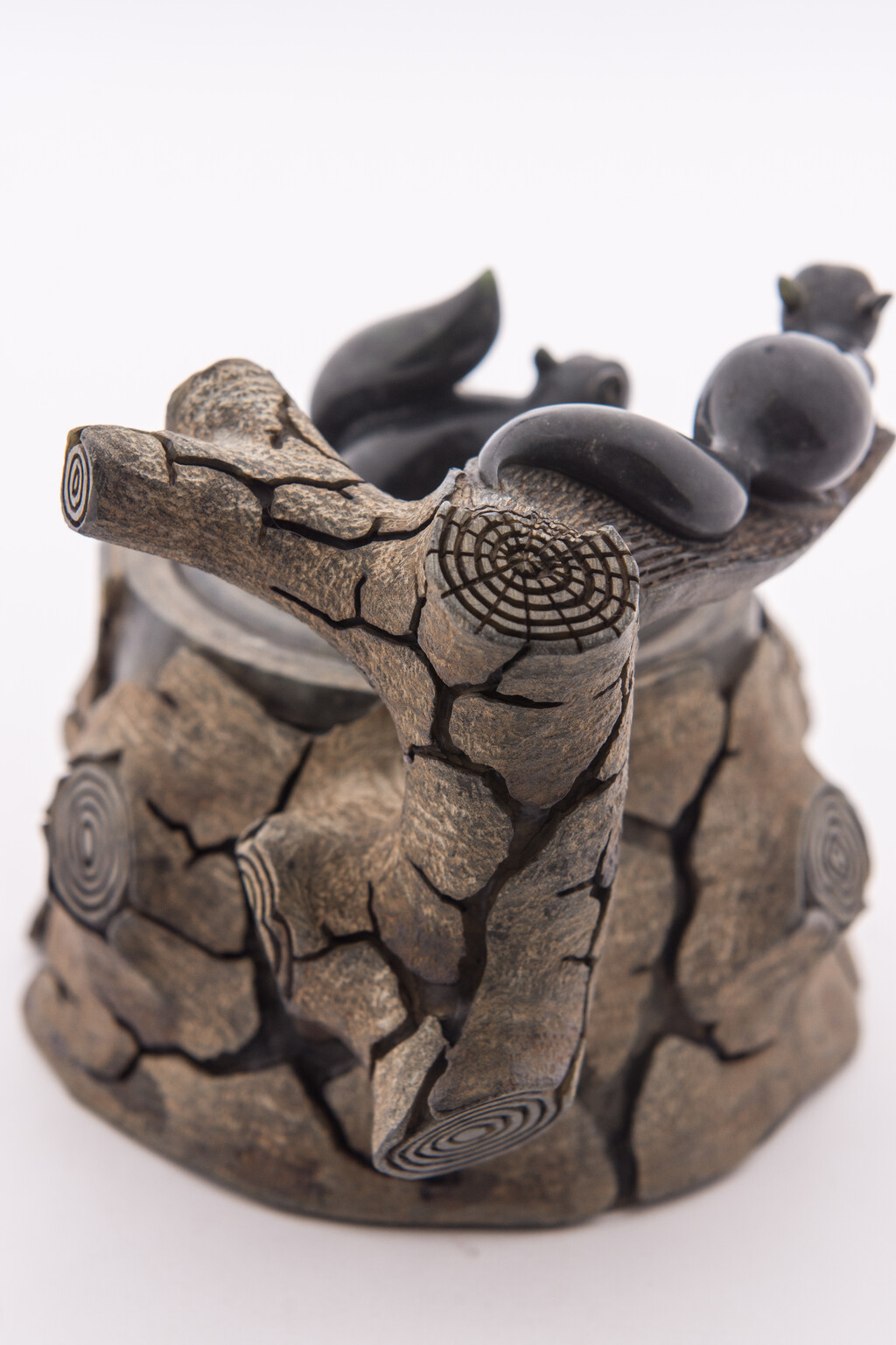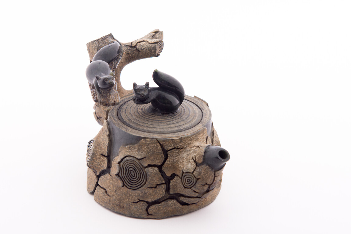 此壺特殊之處在於壺身與壺把刻以木形,顯現樹木表皮粗糙感,壺鈕與壺把上各有一隻可愛的松鼠,悠閒的玩樂。