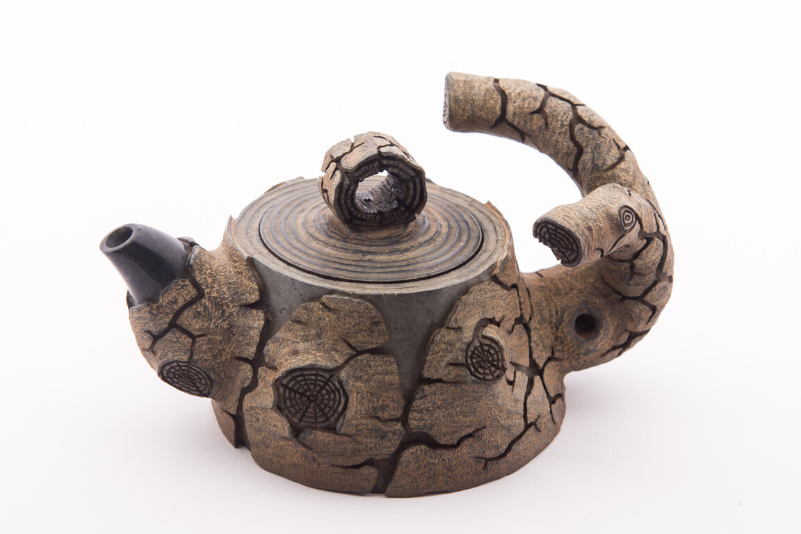 此壺特殊之處在於壺鈕、壺身與壺把刻以木形,顯現樹木表皮粗糙感,樹木橫切面的年輪代表歷經的歲月風霜。