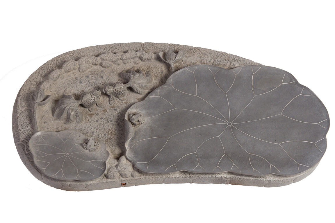 黃櫳賢大師創作的石雕茶盤,利用石頭本身的特色創作,主題包含本土的牧童放牛、蘭花枯木、荷葉金魚、絲瓜藤蔓、螃蟹泥沼、木紋昆蟲等系列,愈發展現過人的雕琢功力。
