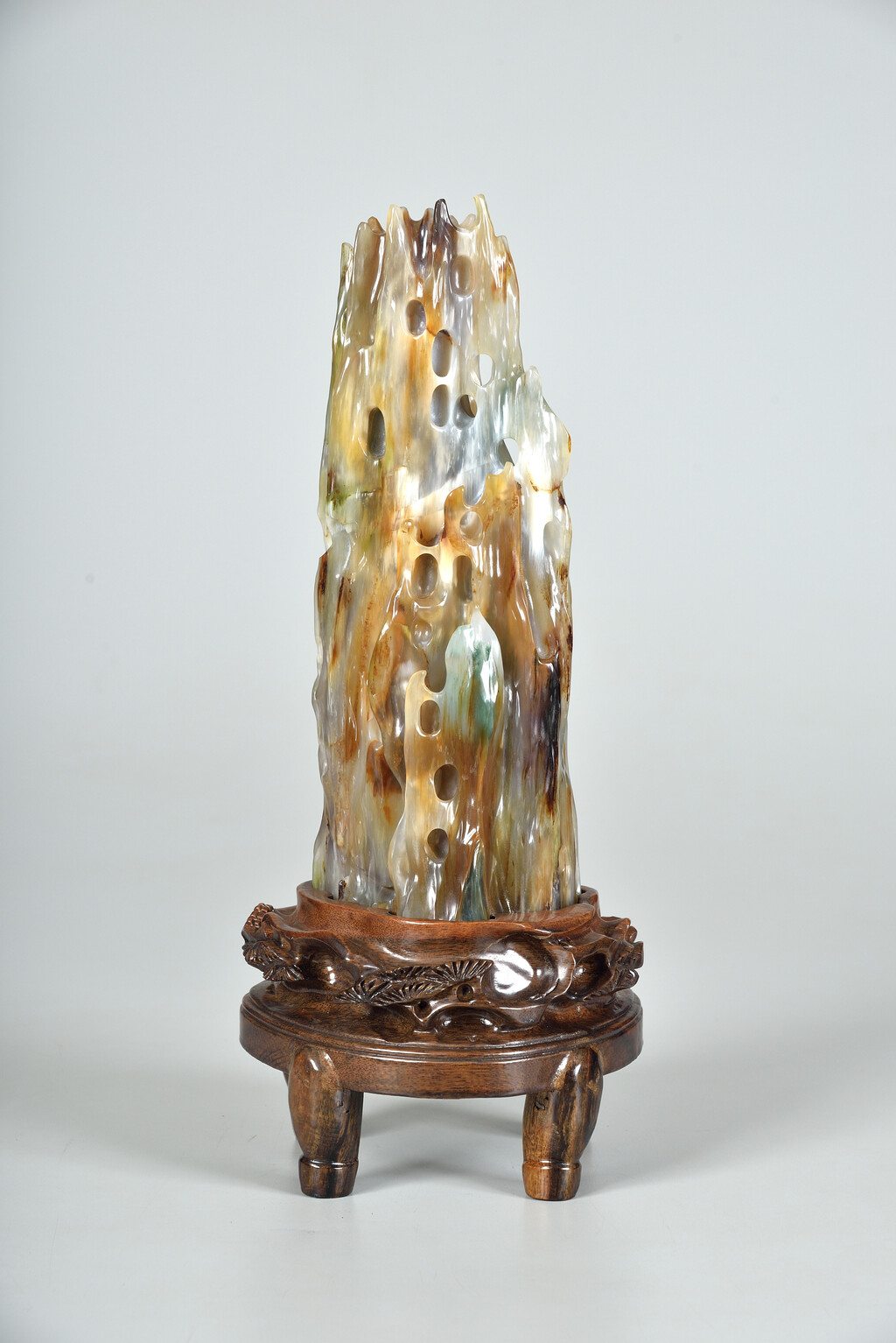 樹化玉是由緬甸產出的瑰寶,具備玉石、化石、奇石三大屬性,中國民間傳統認為,玉石具有驅邪效果,「樹化玉」也不例外,一向被歷代達官顯要視為鎮官鎮宅之寶,有所謂「官無樹玉不利市,家有祥石乃興隆」的說法。此作晶瑩通透,金黃中有幾抹翠綠,實屬上品。