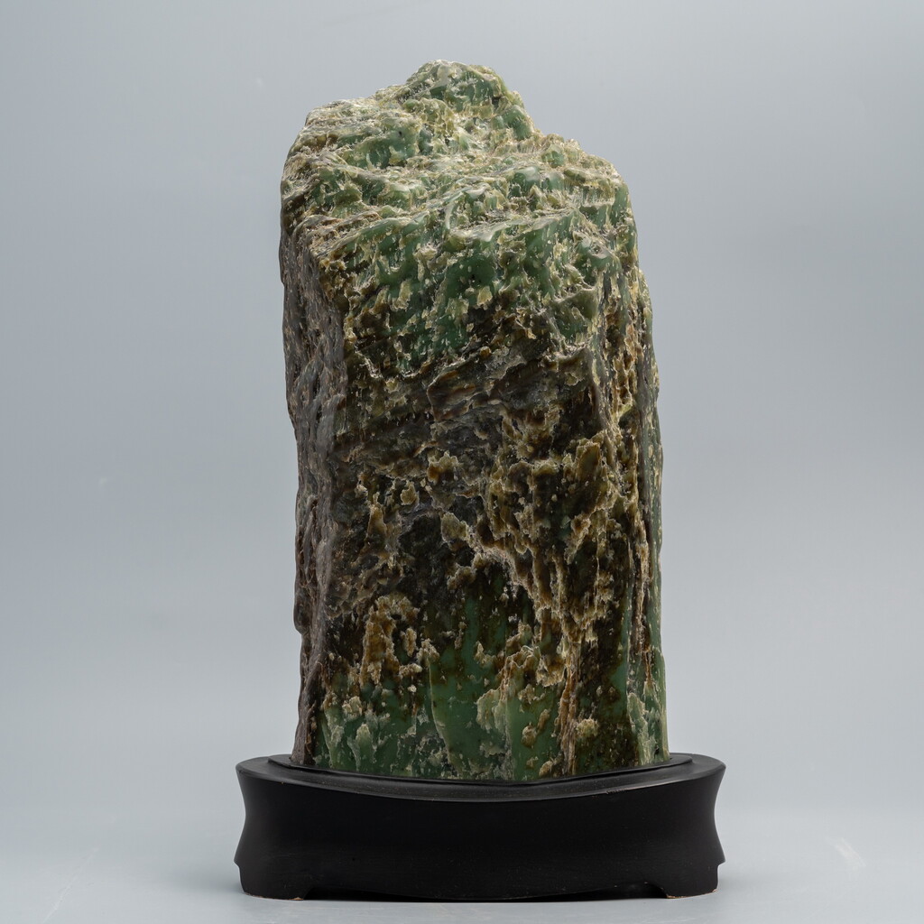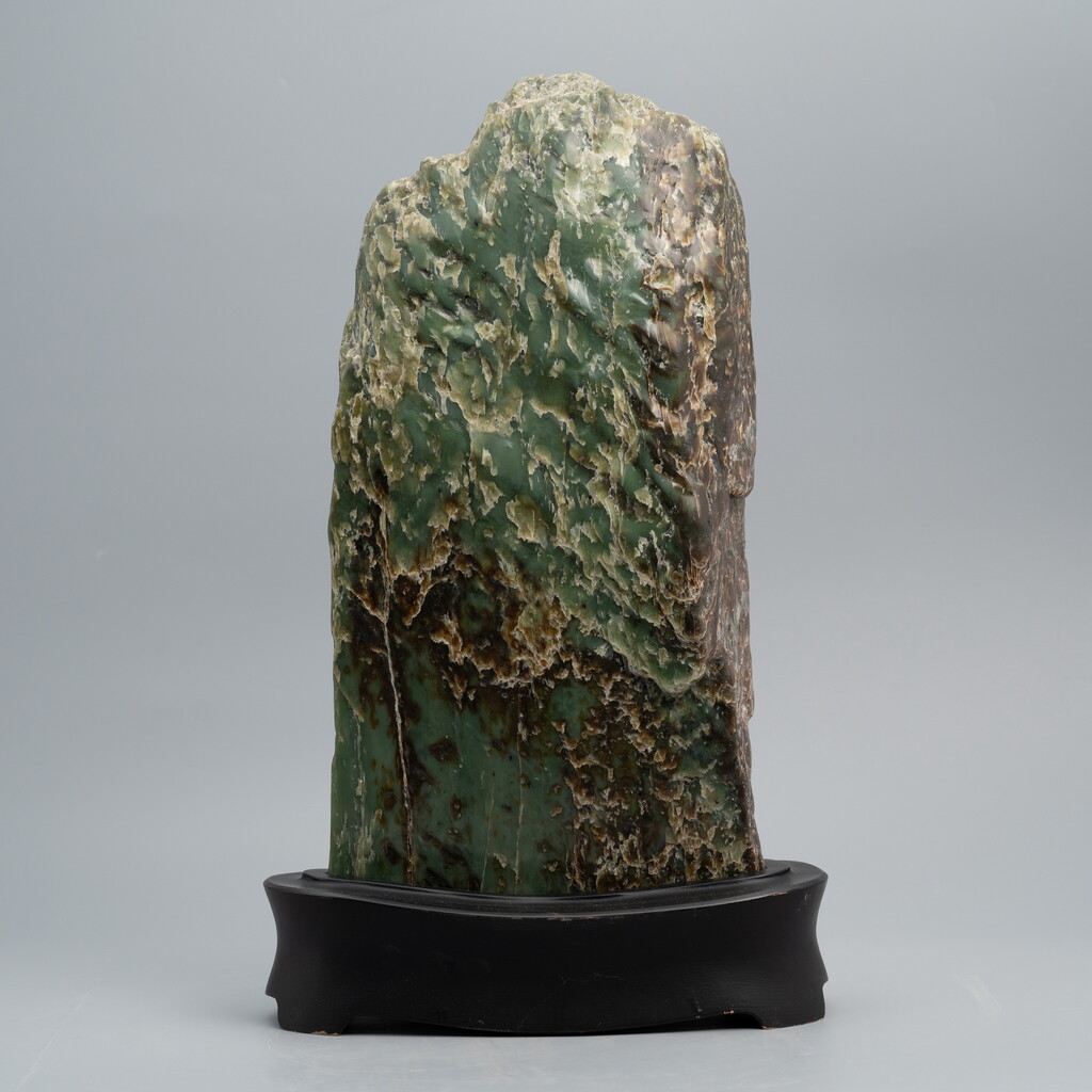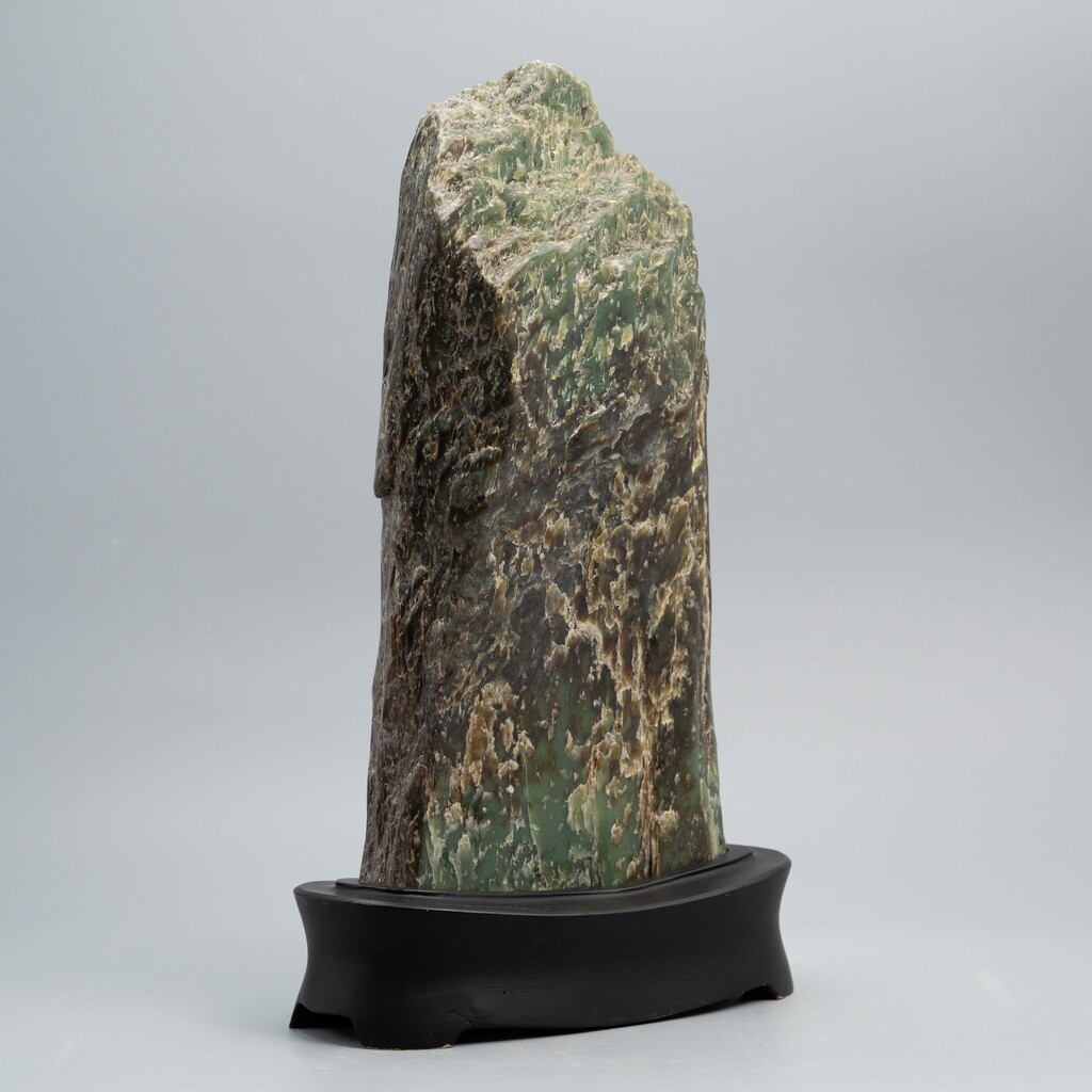 此作品高度53×寬28公分為偏長高嵩山型原石展出。其玉石本身外皮乾淨除理,保留其天然滄桑風化之美,及泌色之美。層層峭壁的層次感,使高嵩之山嶺顯得秀長而壯觀為此石之欣賞時宏大而心曠神怡。
