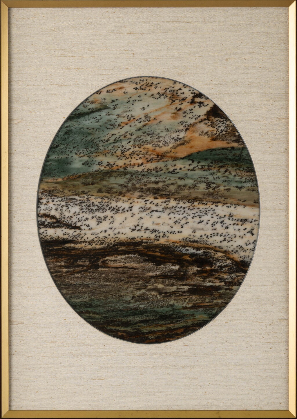 以瞳孔視覺設計圓型舒適之石畫,內藏三彩多色變化,取之精華部分,天景、山景及河川、地景為主題材相當漂亮的搭配,峽谷中成群的飛鳥點綴出景觀裡生命的活躍,整件作品景致佈局完美之石。
