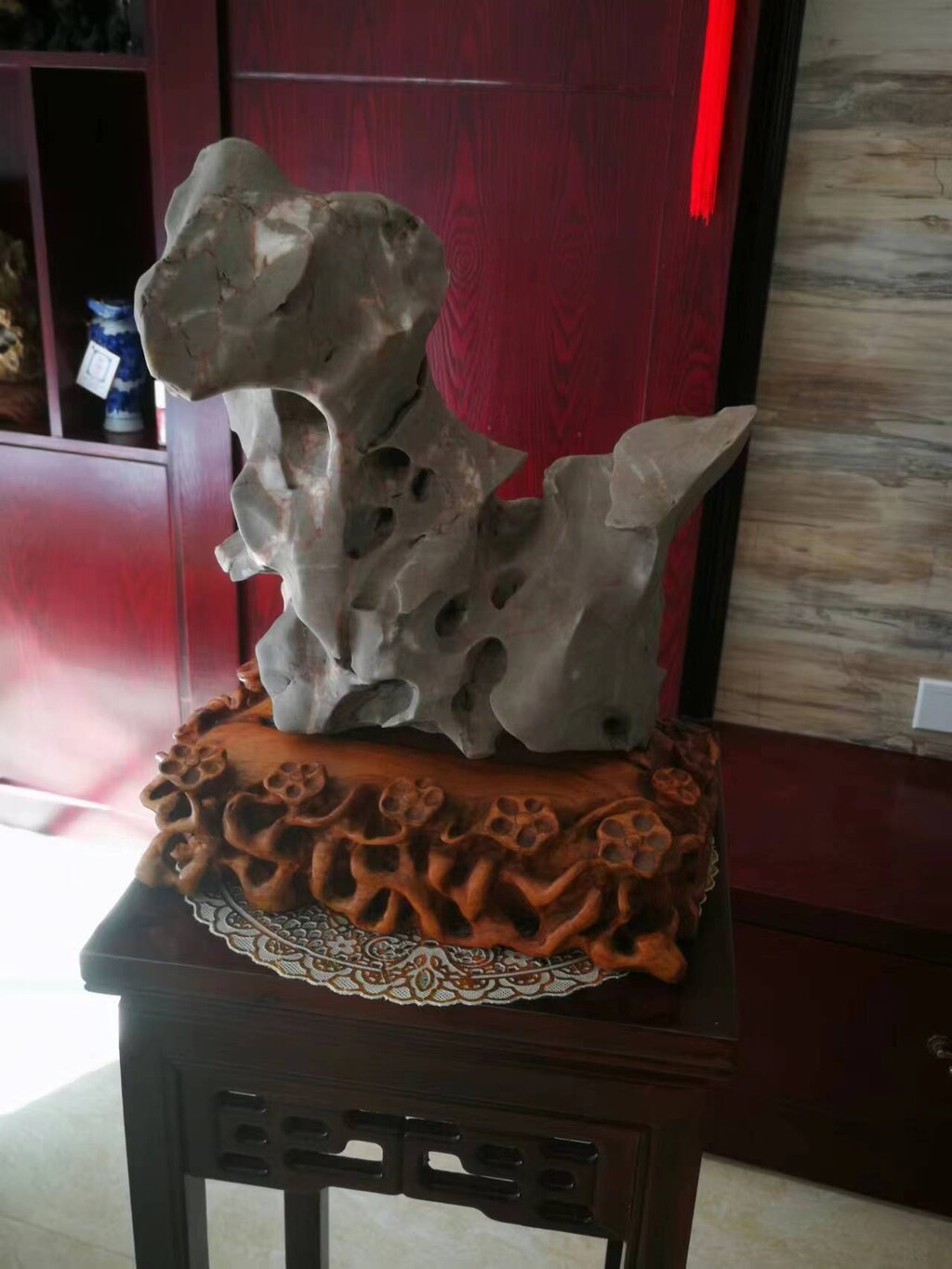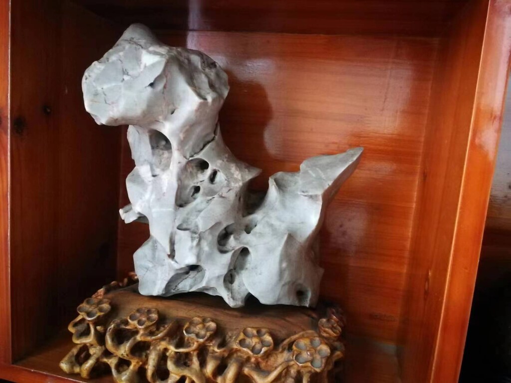 仙潭深處遇得,取名“神犬旺財",石經億萬年大自然的鬼斧神工巧合成型為一隻憨態可居的小狗悠閒的扭頭翹尾坐在草地上,盼望著有緣人把他領回家中。該石表面完整無創傷,石質堅硬,石面光滑如玉, 石中經億萬年水沖自然形成一個又一個圓滑的小石洞,且洞與洞相通,石重16公斤,長30釐米,寬15釐米,高28釐米,是世界奇石界難得一見的大自然佳作。