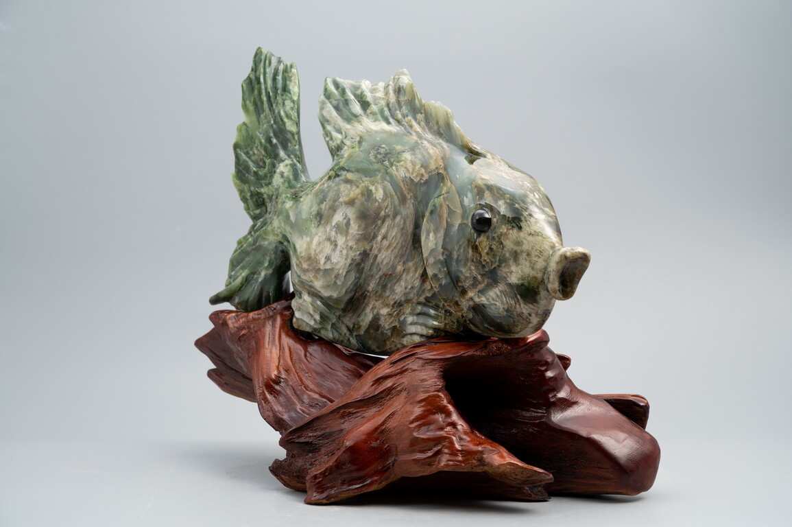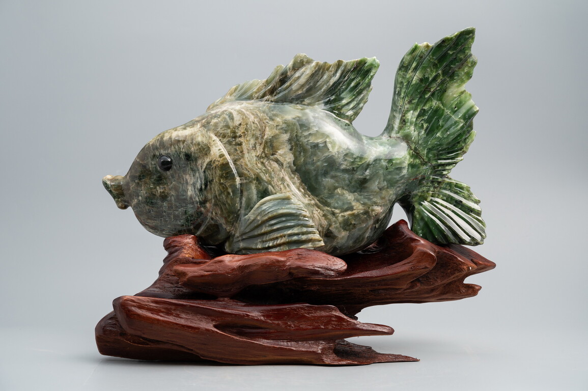 此作品料為早起保留上等之玉料,中大品適當之魚創作雕法“年年有餘”深海魚活躍表現,仍取玉礦中交綴變化之料來呈現,頭部、眼神亦有精神存在、魚尾之翠綠礦料,特色展現出前進游水的力道。整件作品栩栩如生,收藏之“年年有餘”。