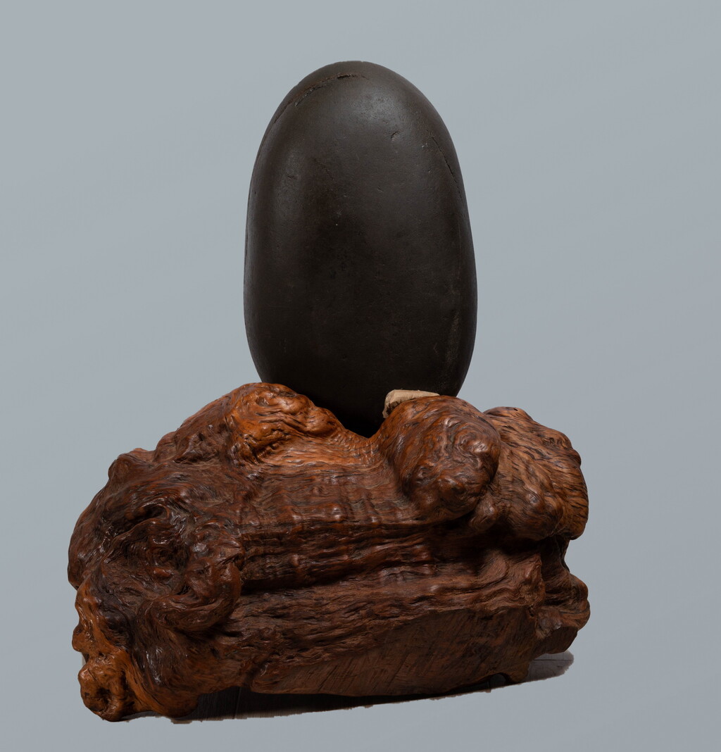 石型畫面長且順圓,加上台座是肖楠木瘤制作,整體視覺大器。拉長式畫面的夜空裡,月娘微笑高掛在樹枝上望著樹枝上深夜未眠,尾巴精神抖叟,痴痴等愛人的猴子。此景含義深厚、有趣,有台灣俚語自賞、自損、歉意且痴情不離於此美景或第三者離捨之情意…有深度幽默之美石。
