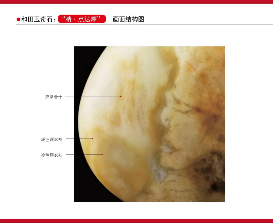 此和田玉籽料原石-奇石,籽形天然完整,沒有任何人為痕跡,整個畫面酷似一幅“達摩老祖合十禮佛圖”。從上面額頭的虛發,往下是眉間白毫相,眼睛,鼻子、鼻翼、鼻孔,嘴,上下唇,唇線,嘴角線,都非常清晰可見。再往下是下巴,脖子,衣領,往後是耳,耳屏,外耳道口,耳垂,耳環,都十分精准,臉部正前面,仿佛合十禮佛的雙手,左下是冷暖兩色的衣袖。整個造型都是和田玉獨特的水線勒形,沁色填彩,恰似一幅工筆重彩的國畫。