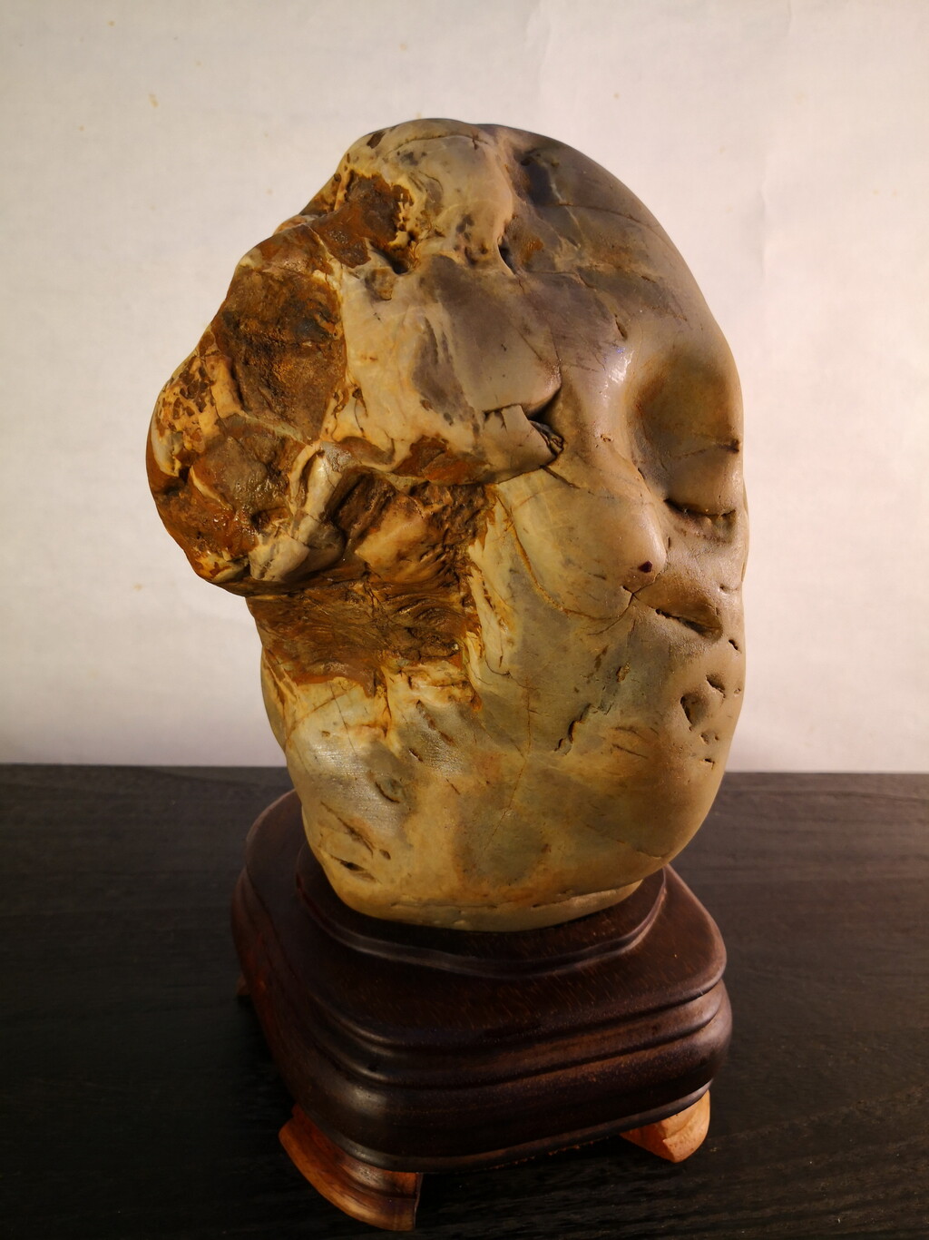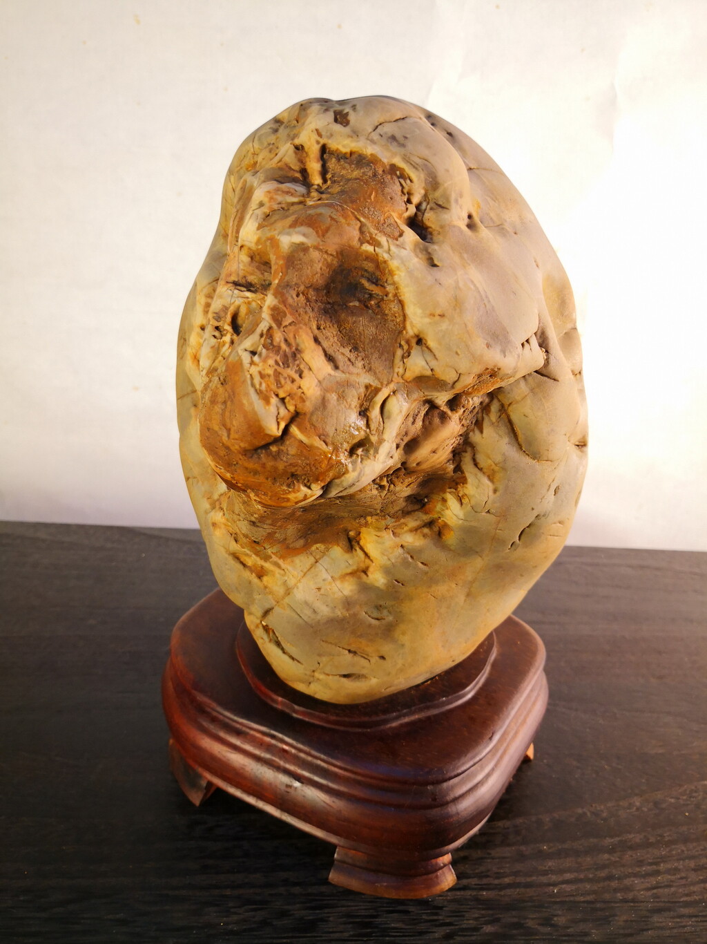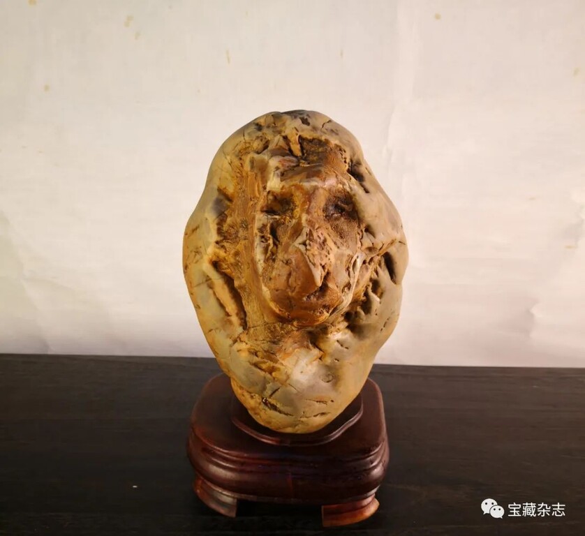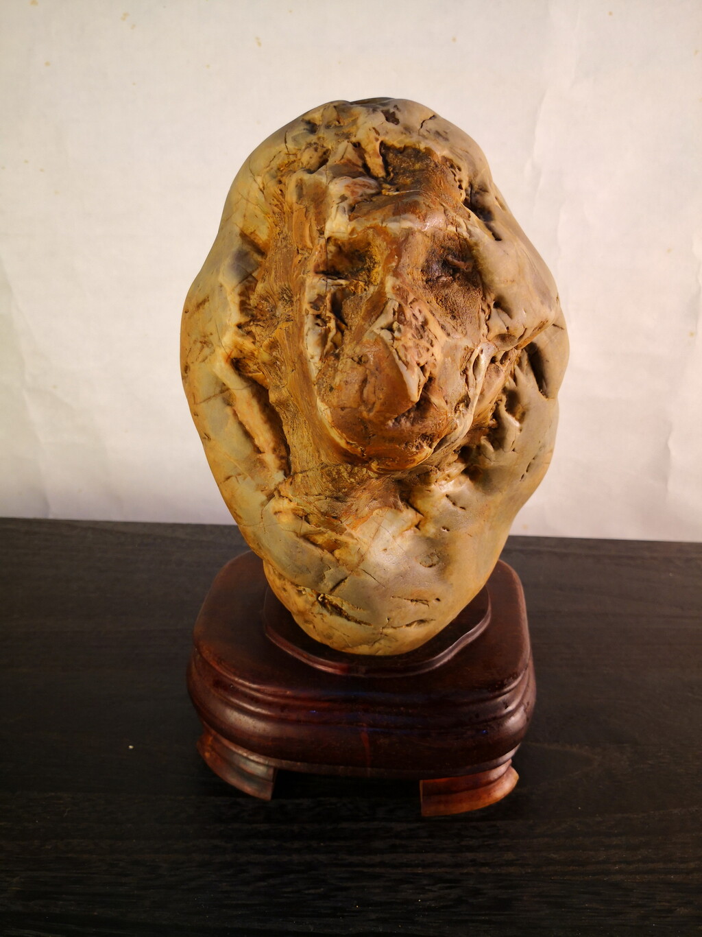 他生於兩億年前的福建沿海華安縣的九龍江裡,歷經歲月滄桑,經受水與火的磨煉,從土石中淬變成一塊璧玉。神態威嚴,傲視時空,從他的眉骨和眼神中可以看到其後代“北京猿人”的影子。