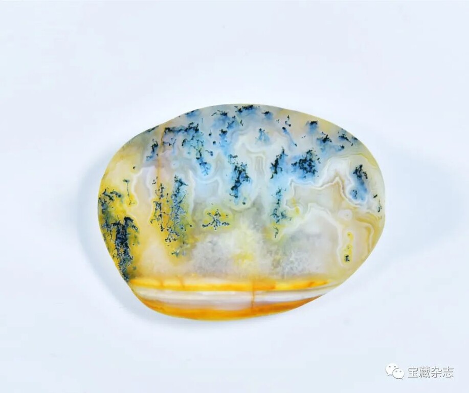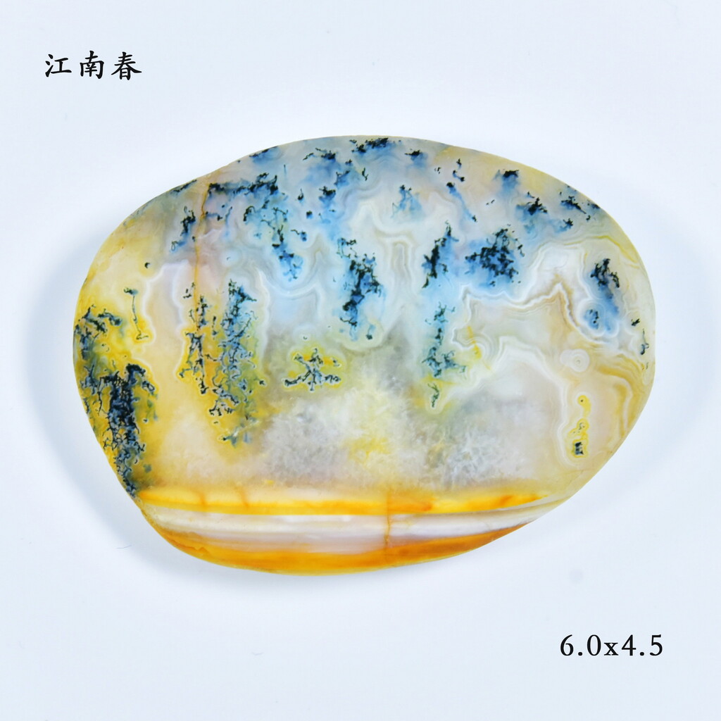 此枚雨花石的質地為瑪瑙,石面下方為金黃色的水線,水線上方為綠柳成蔭,勾畫出一幅江南春的圖案。