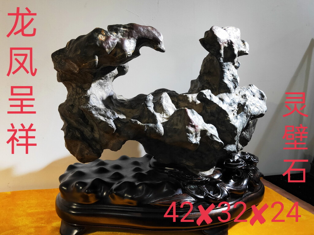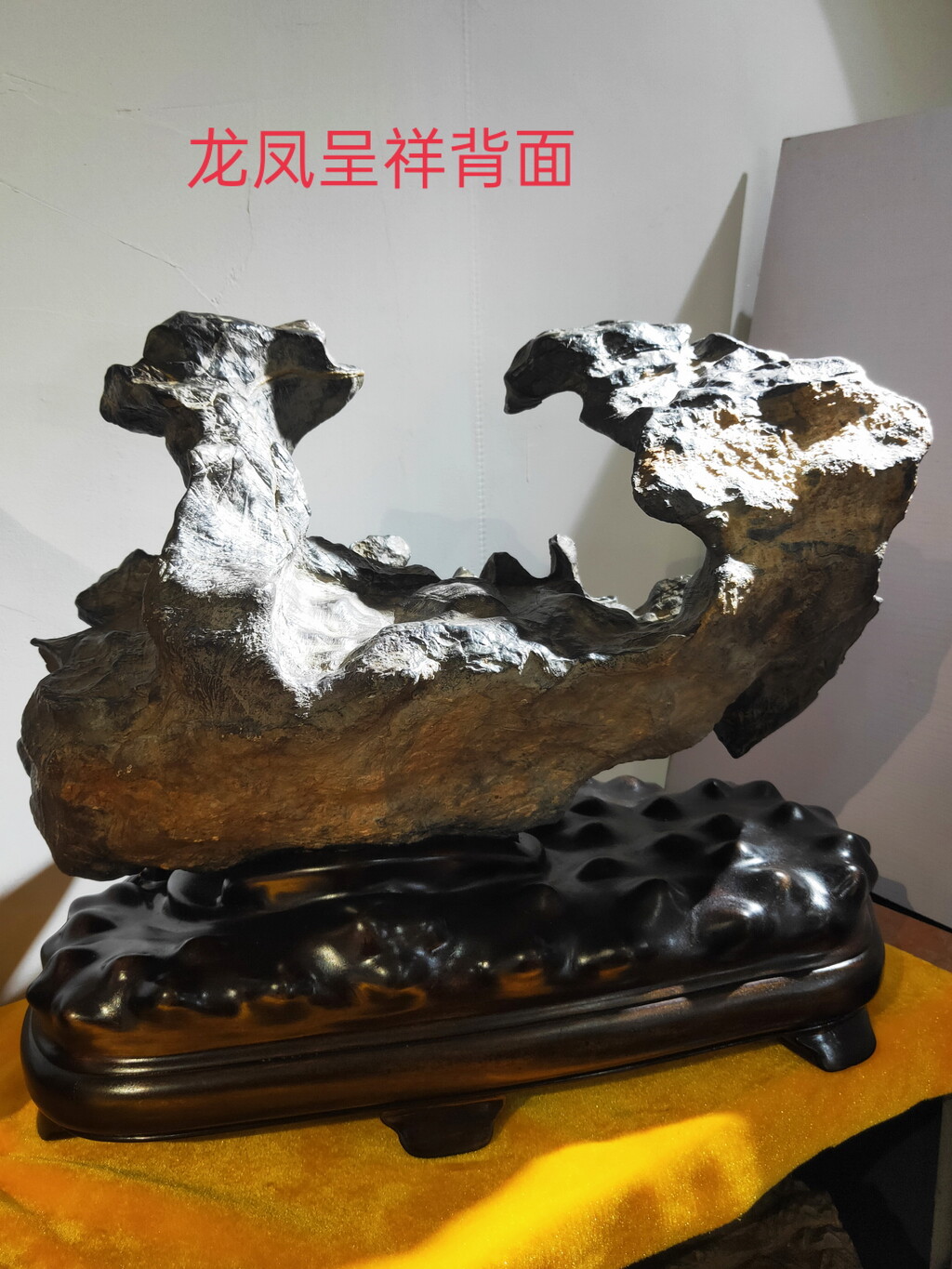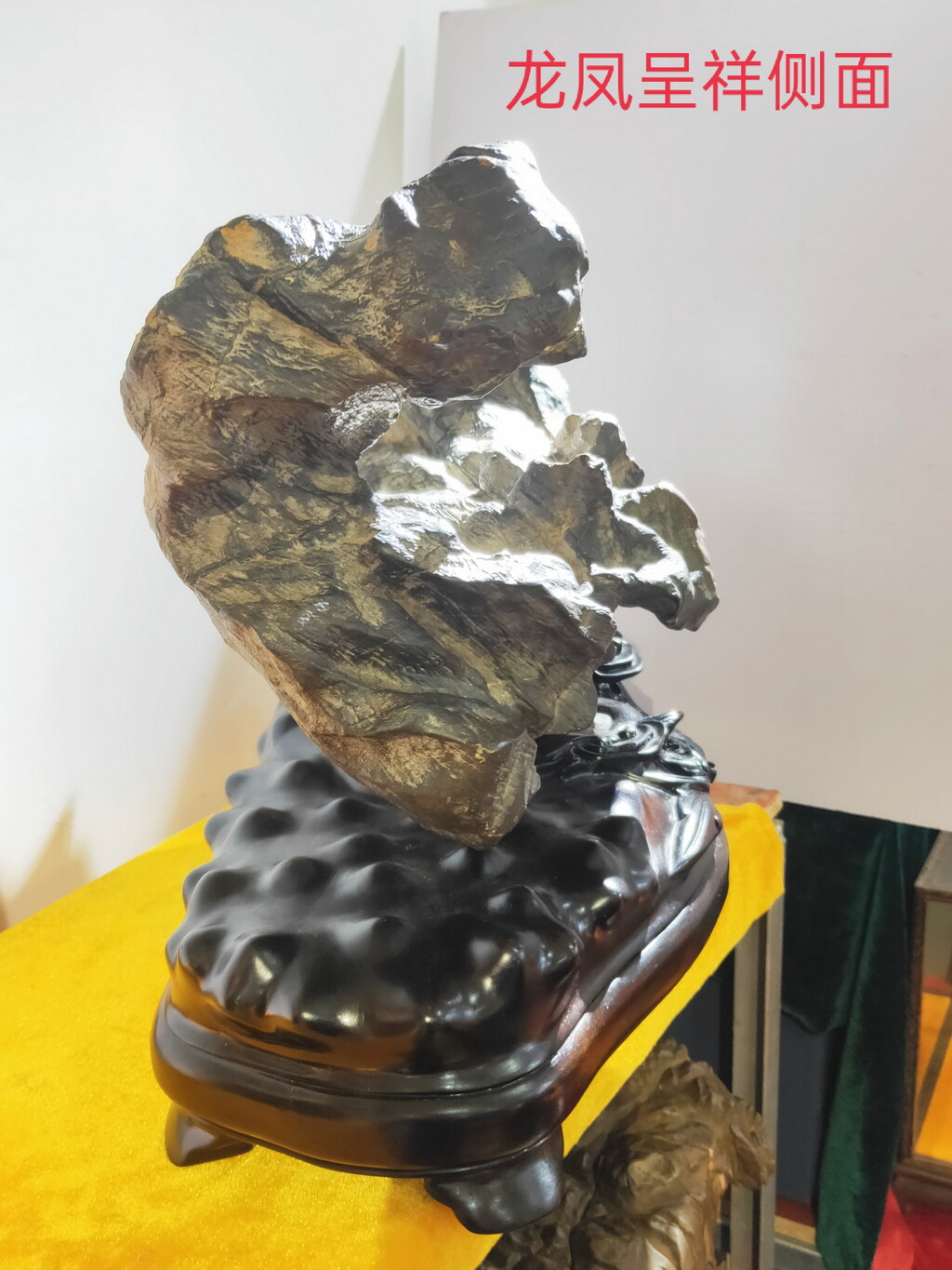 形成“龍鳳呈祥”圖形的正宗天然靈壁磬石(彩靈石),大小適宜,形象畢真,活靈活現的鳳鳥體型,栩栩如生、與龍首相對,互敬有禮,形成“龍鳳呈祥”一幅美麗的吉祥畫卷。