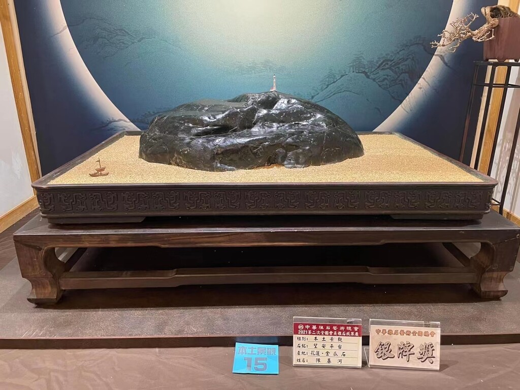 作品解說:金瓜石是有含金量的石種,質地又較堅硬,在深海經過長時間的天然水洗後表皮光滑矽質化,無需再上油就會自然呈現光澤