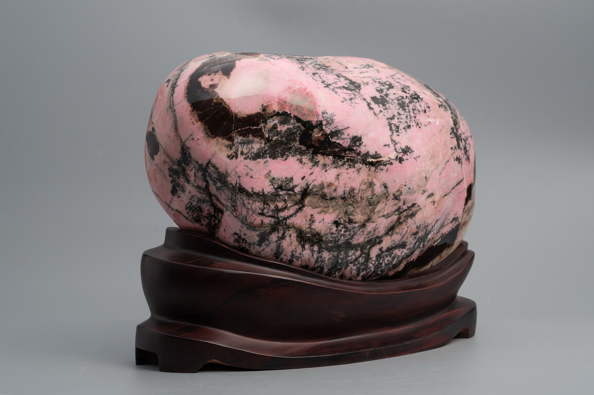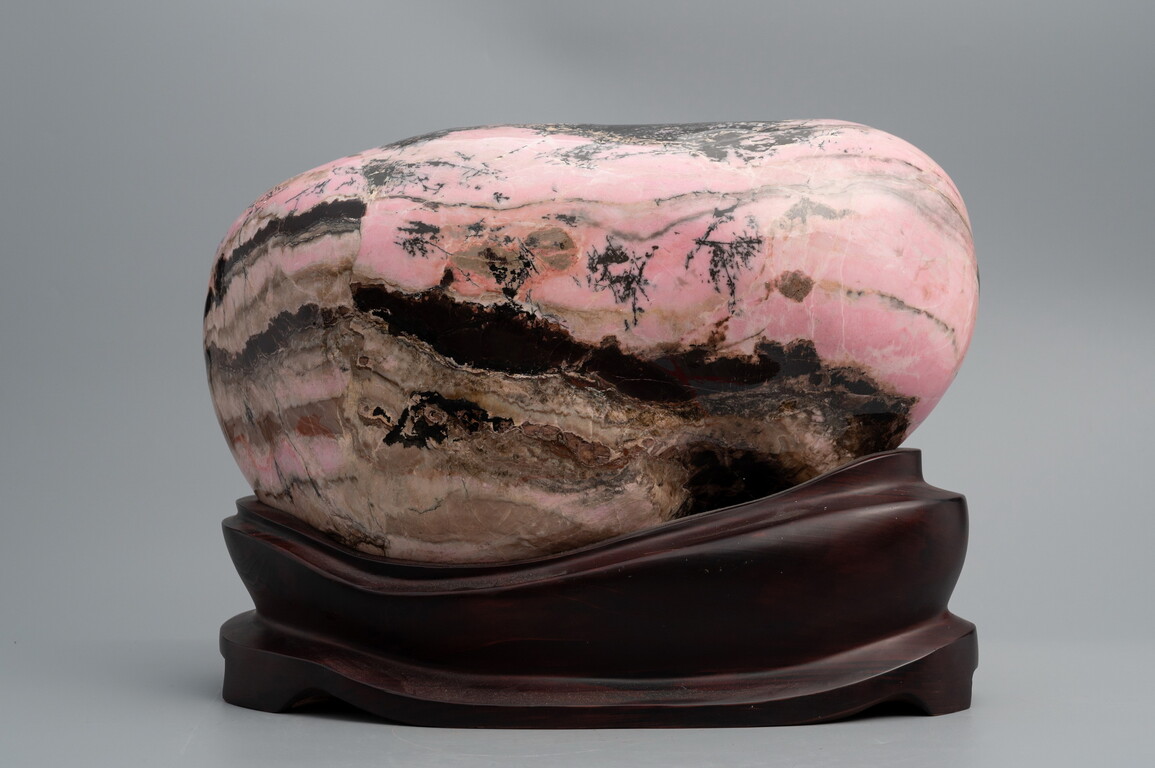 玫瑰石,學名薔薇輝石岩(Rhodonite),摩氏硬度5.5-6.5,三斜晶系。