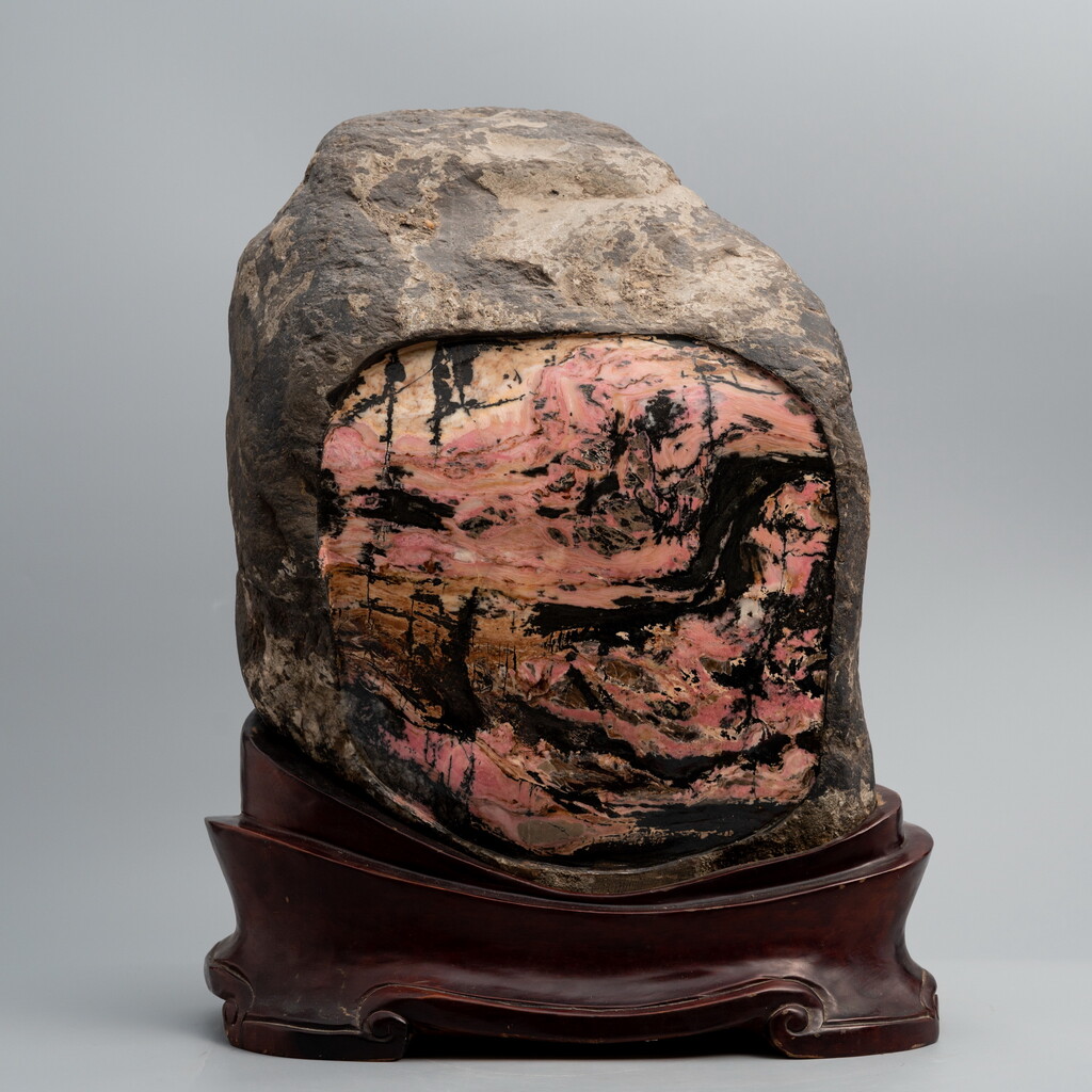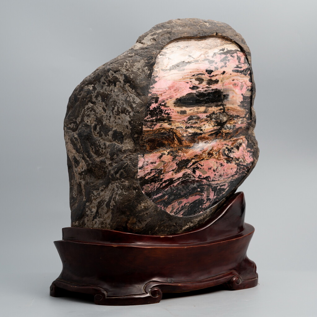 玫瑰石原石取件開窗為景留皮之特殊創作,開窗見景處,要有相當經驗的師傅和福運才能如此佳作~高嶺曲澗石高為雙層上下水澗曲折流動,而成一景,粉紅色滿佈的玫瑰石料,開窗成品相當難得,其餘留皮處,還有很大美的空間期待展現。