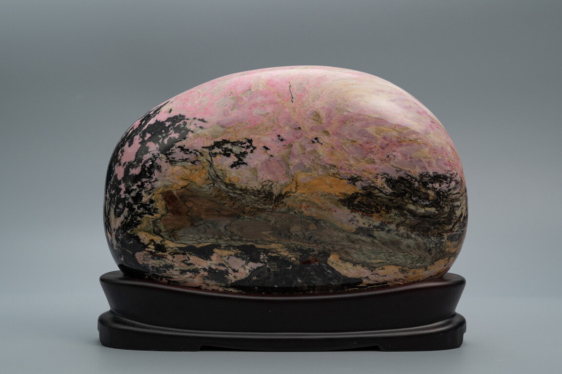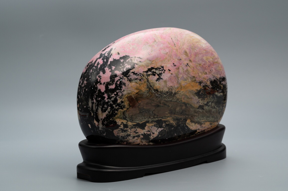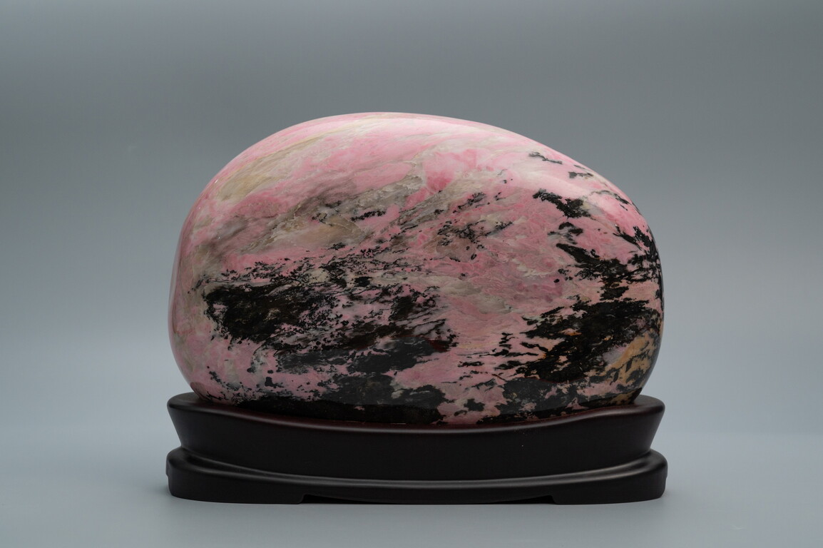 玫瑰石,學名薔薇輝石岩(Rhodonite),摩氏硬度5.5-6.5,三斜晶系。