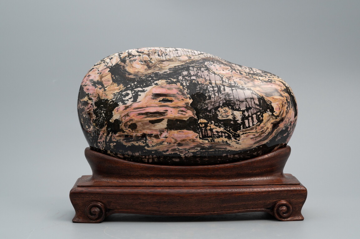 玫瑰石,學名薔薇輝石岩(Rhodonite),摩氏硬度5.5-6.5,三斜晶系。