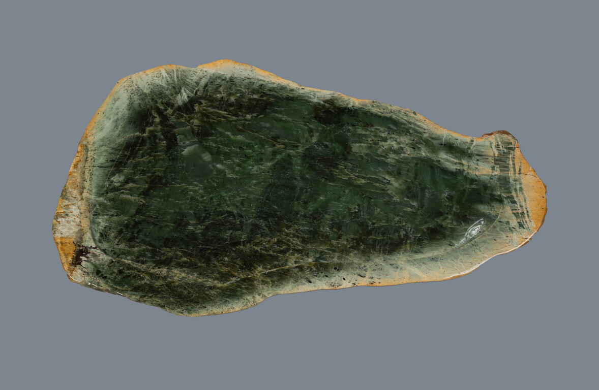 台灣玉礦中尋找如此大品、翠綠、留皮、開窗見底、無瑕疵、密度高的玉石真是困難極高。傳散冷熱度快如此條件方可選取來創作茶盤之料。