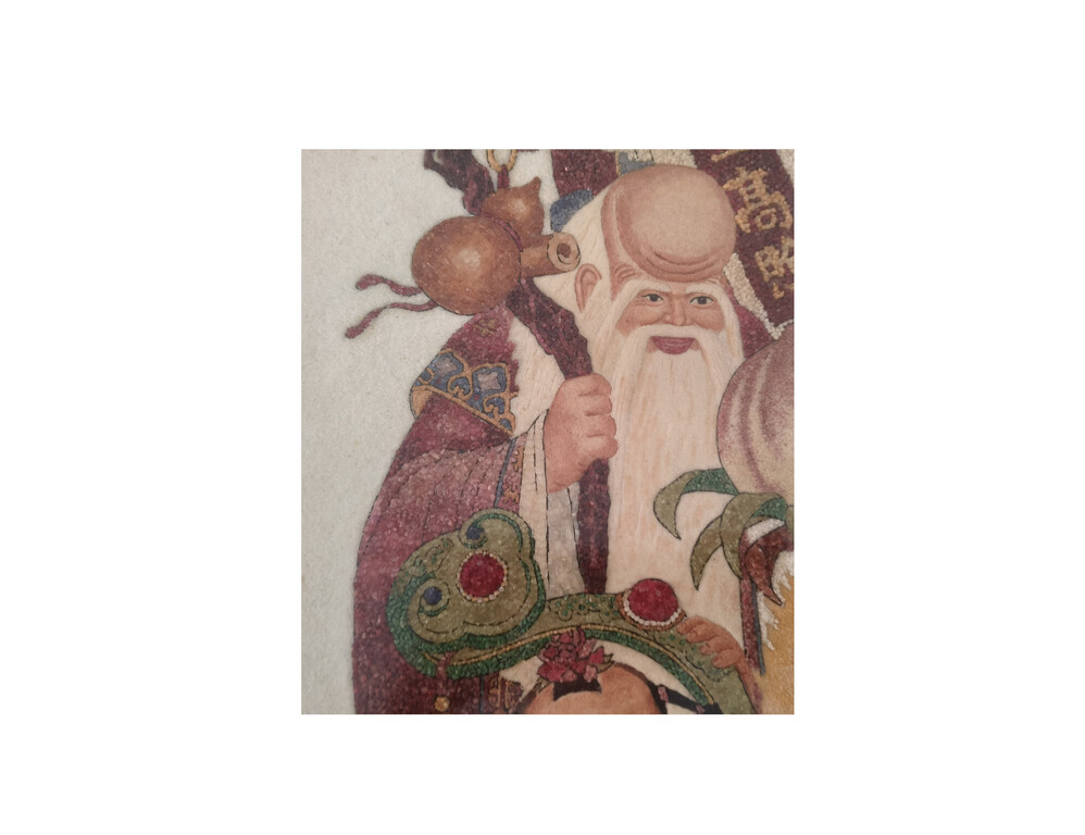 本作品重量8kg(含木框)全都天然的碎石,只有臉部沒有碎寶石,其他的部位全都是緬甸天然的碎寶石,依最低的預估純粹寶石部份應有5kg左右,這幅「福祿壽」寶石圖屬於「古董藝術品」,依行家告知以目前合灣珠寶行業,要粘這幅畫的專業技術人員可能很少,這幅「福祿壽」寶石圖有意讓藏,等待、尋覓「有緣人」。
