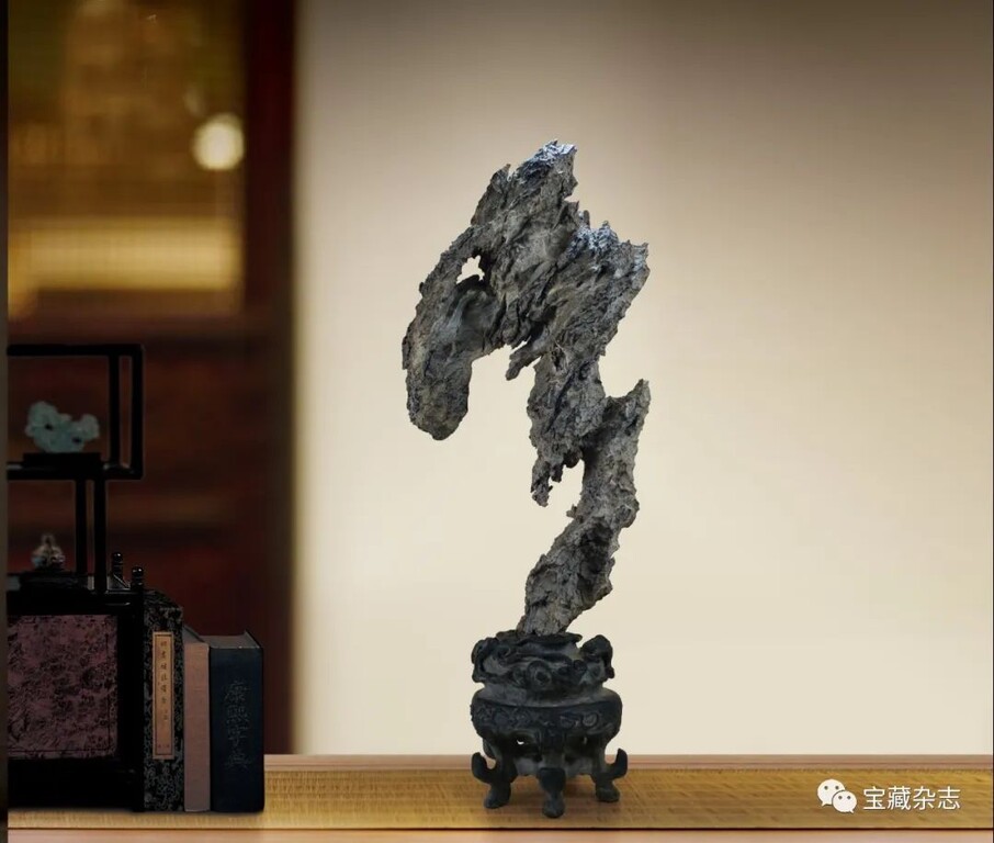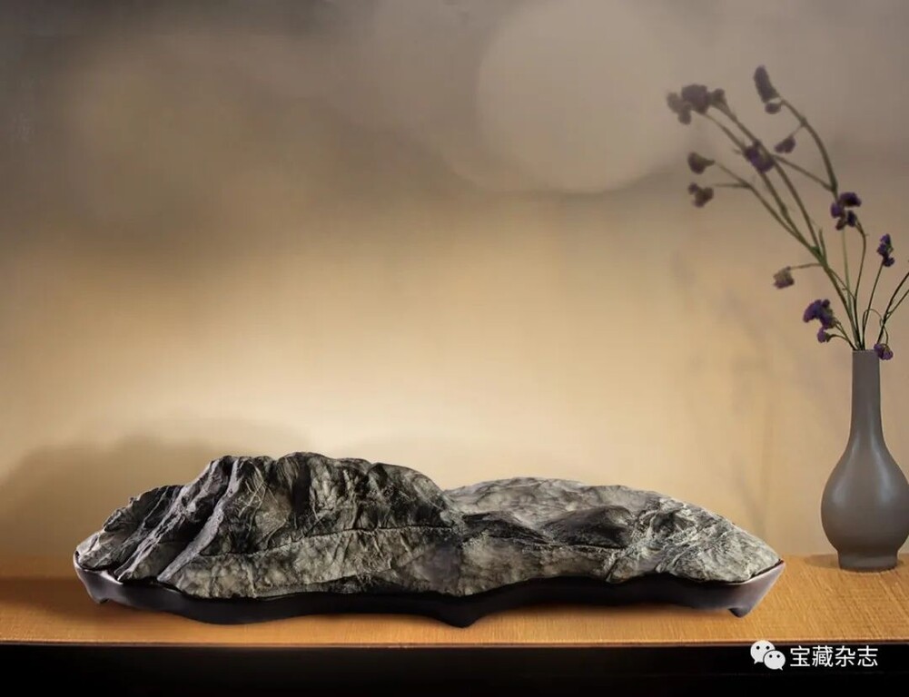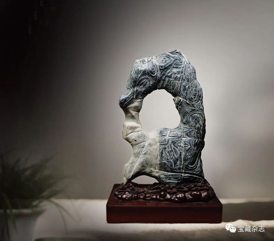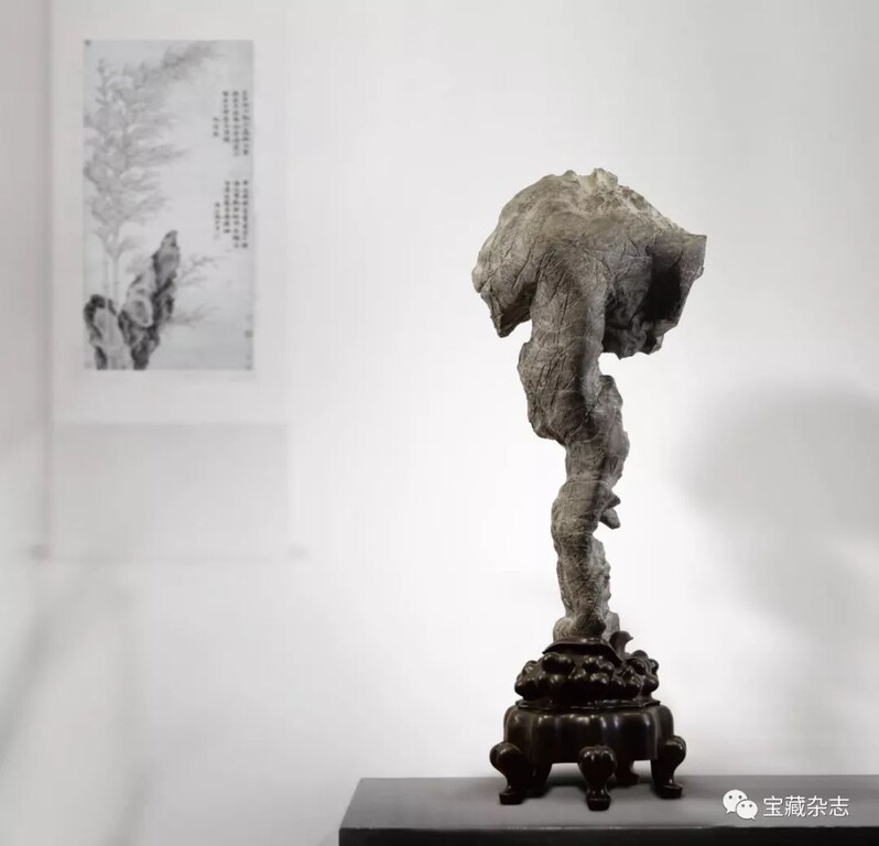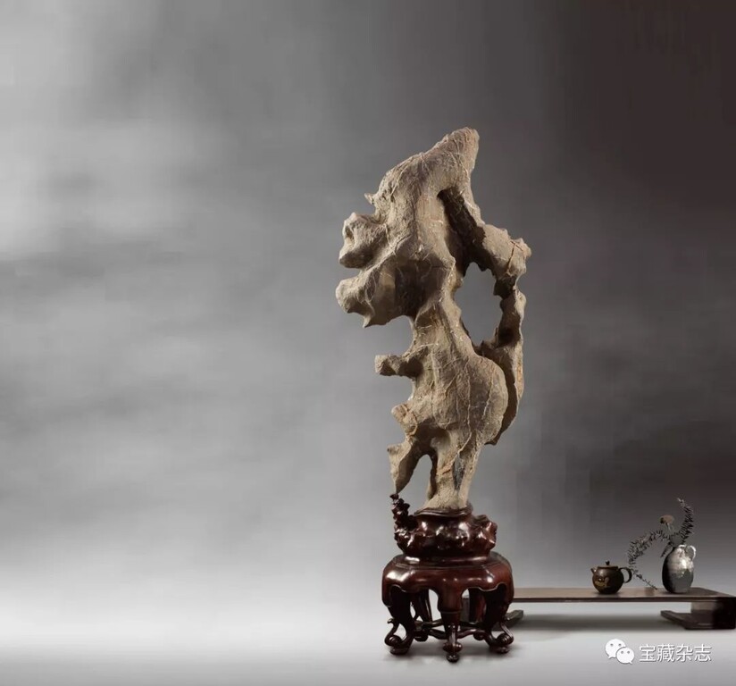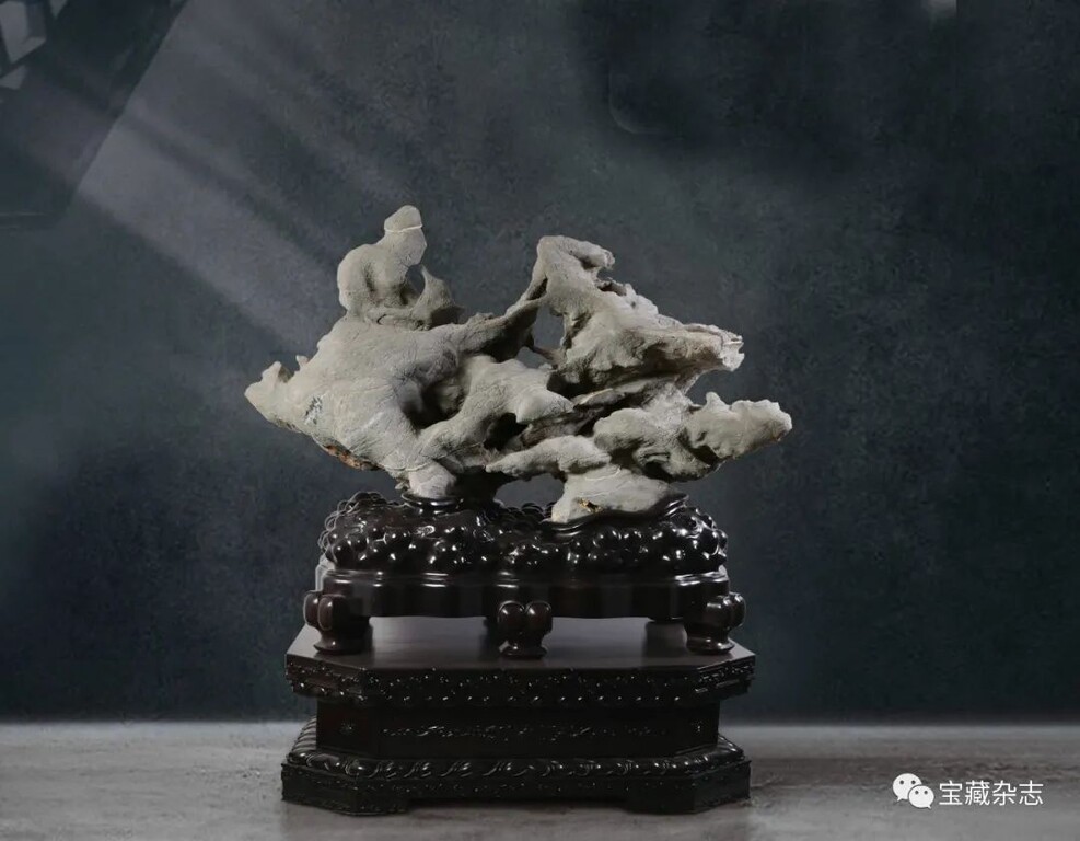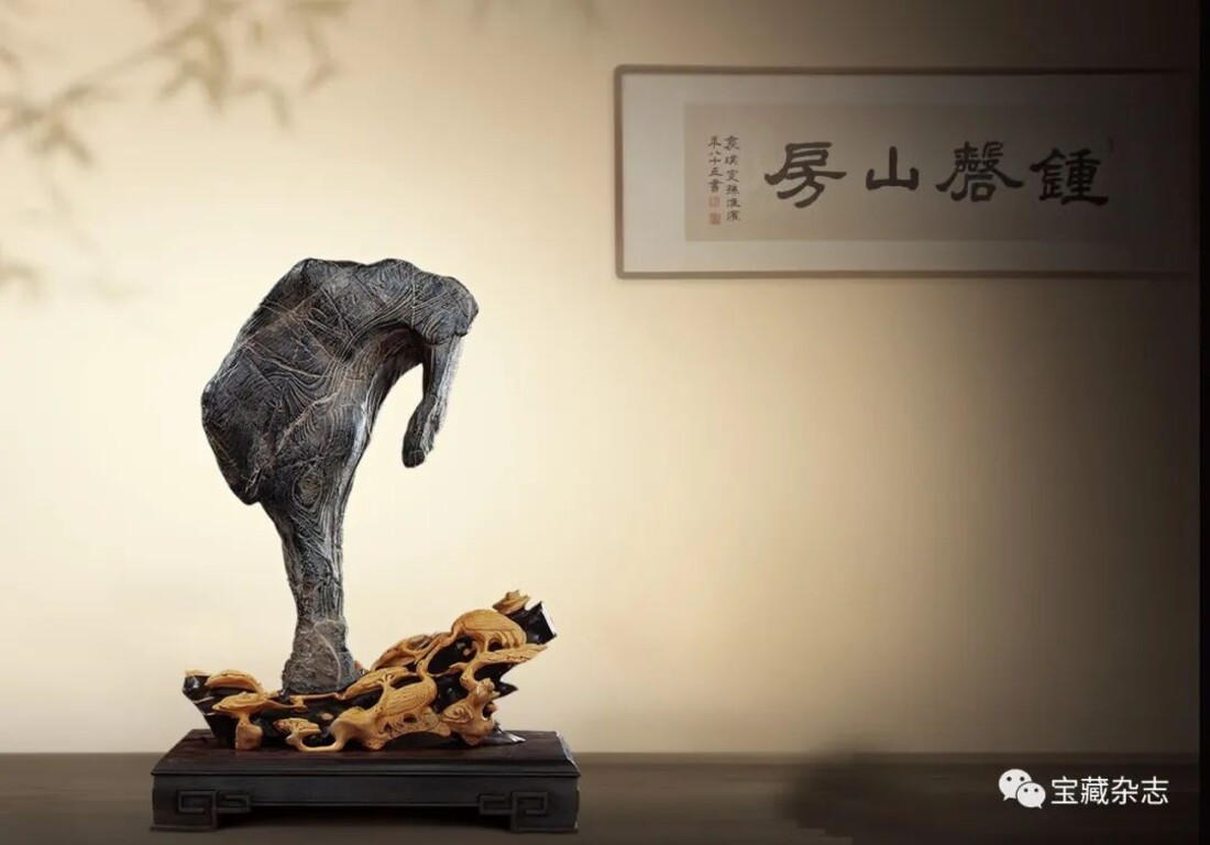 而當代人所指的“古典賞石”實際上專指傳統石種配置明清時期的底座樣式,大多涉及審美物件的感官形式。往深講,古典賞石是客體形式與文化氛圍的統一體。如古代文人士大夫在廳堂、文房和居室內,將供石置於桌案、幾架,並在顯著位置綴以書畫或文玩,保持文性古雅的空間格調。