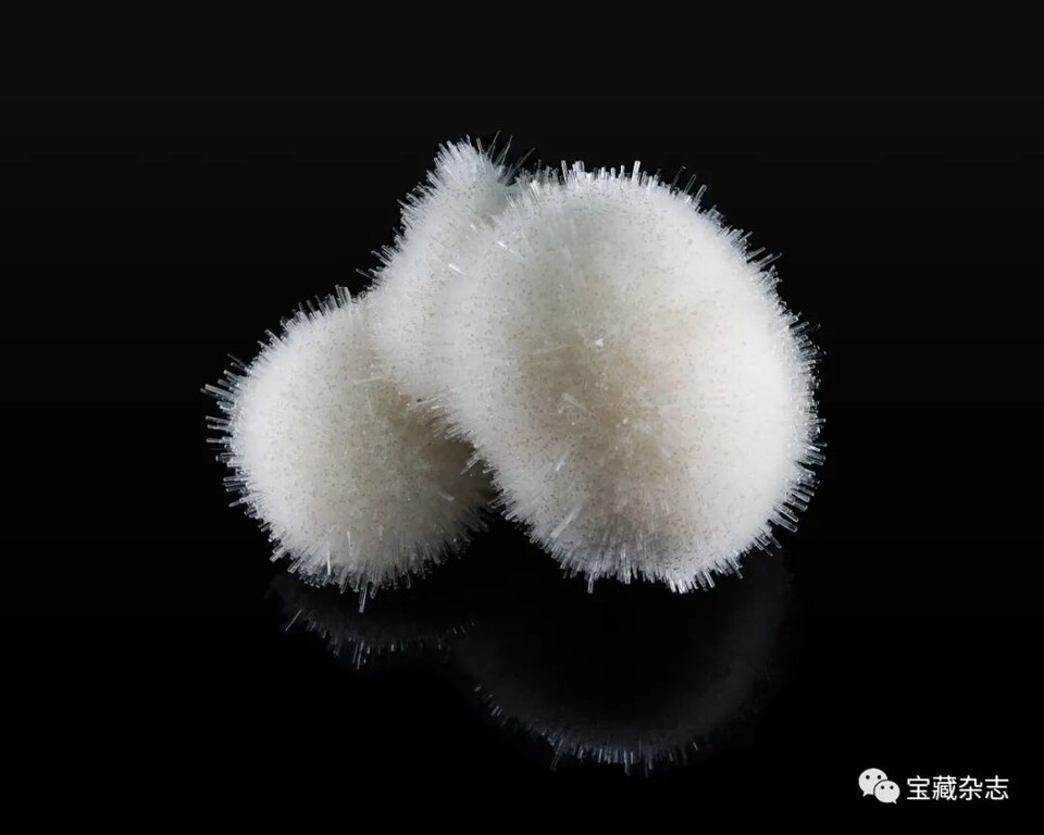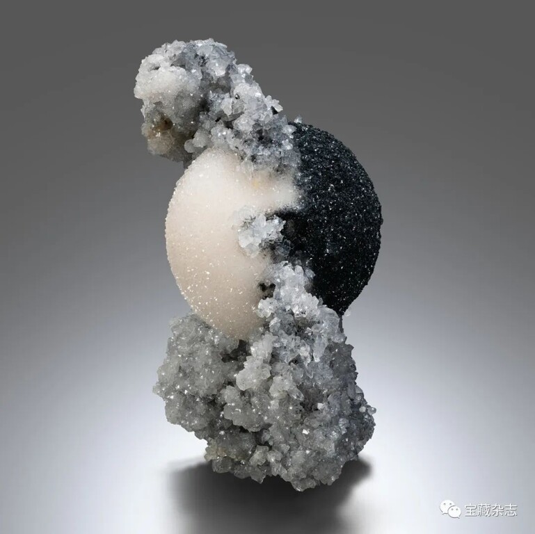 黑白方解石球狀晶簇,白色半球是方解石的常規色,黑色半球是因為方解石中包裹了硫銻鉛礦,球狀外形則是因方解石以獨特的扁平菱形形態呈放射狀生長而致。