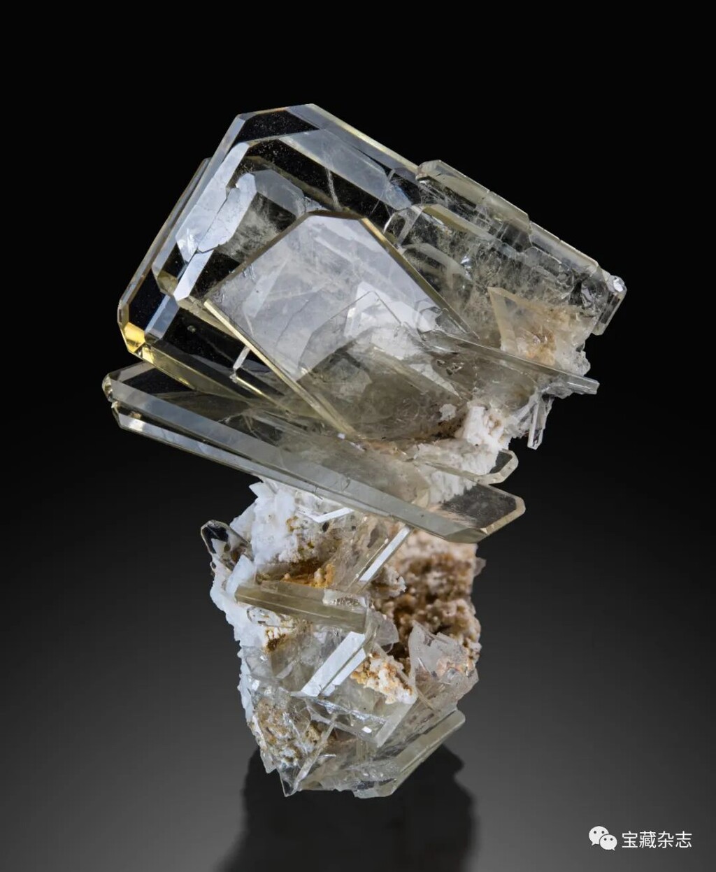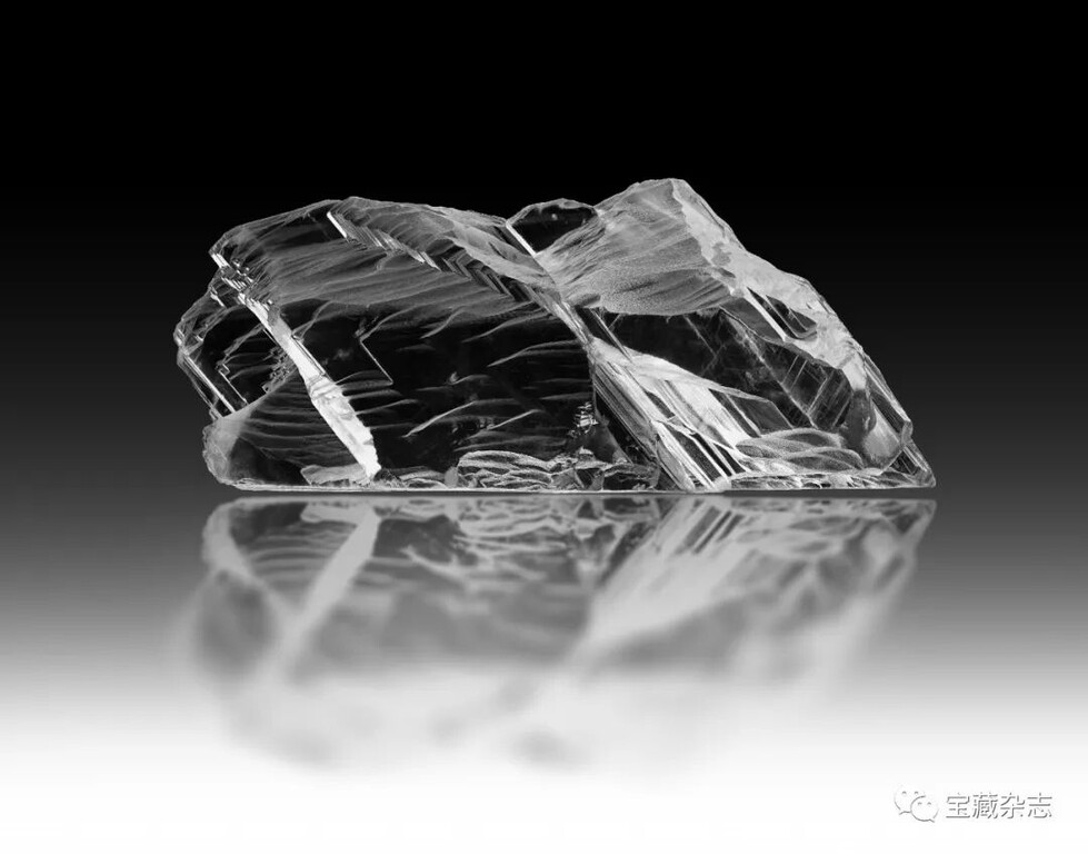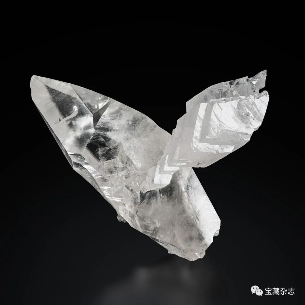 無色透明的石膏晶體,表面可見清晰的生長條紋,展現出燕尾雙晶的形貌特徵。